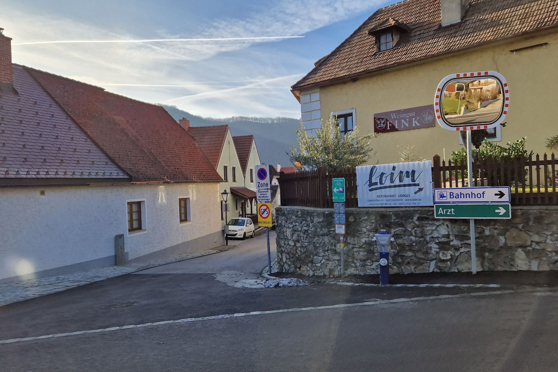 At the end of the road you have to turn left and then at the Weingut Fink you have to turn right into the main road of Unterloiben.