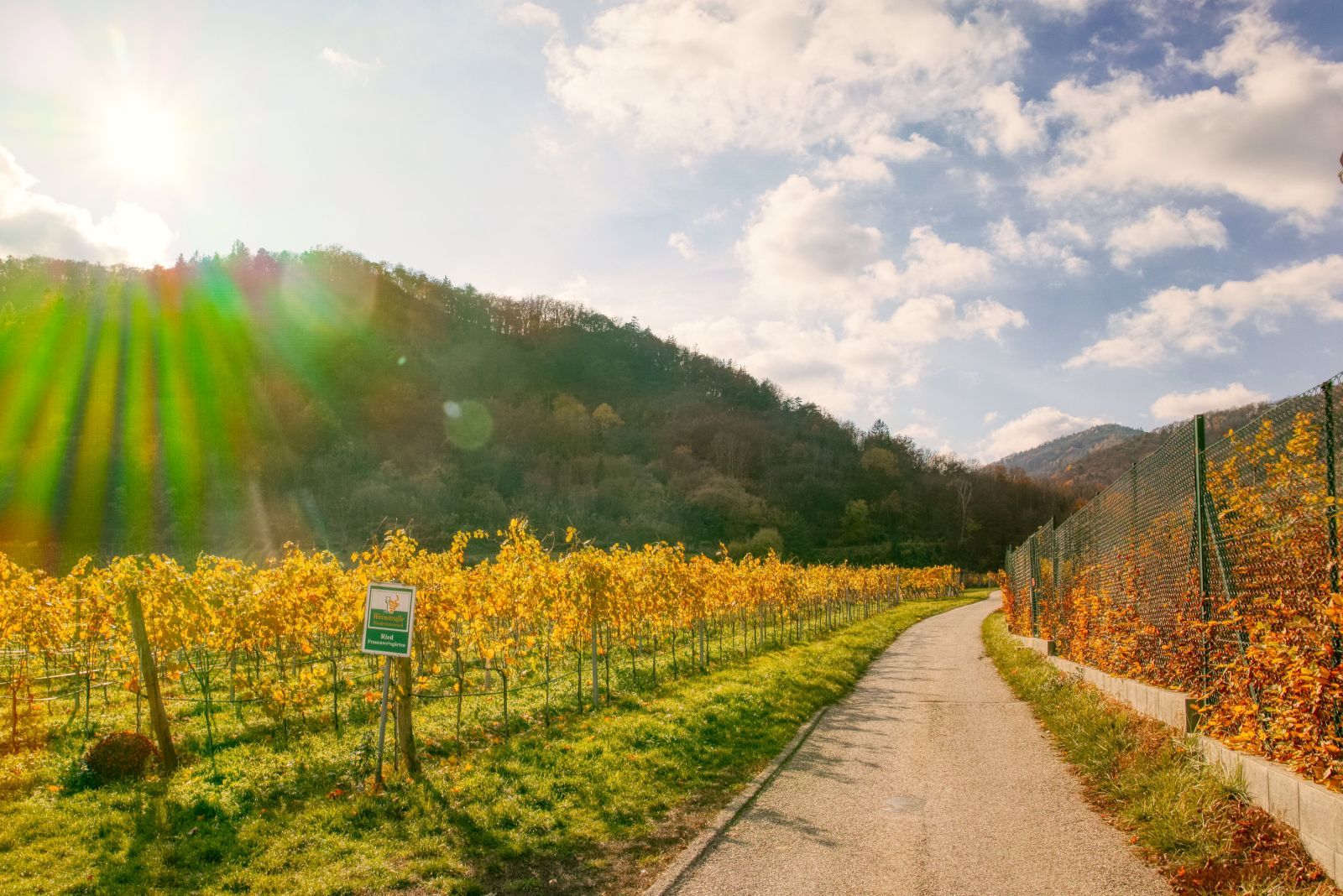 Here you have to walk up the hill and walk a little bit through the wood, then you have to turn right and cross a vineyard.