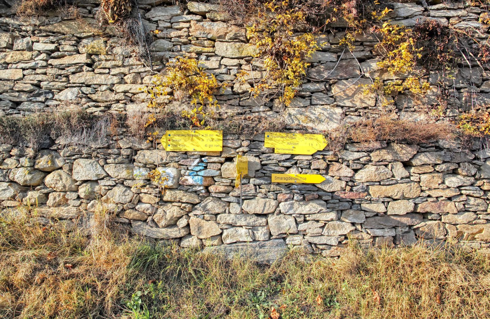 You have to walk through a vineyard, then you have to turn right and continue following the signpost "Smaragdeidechse".