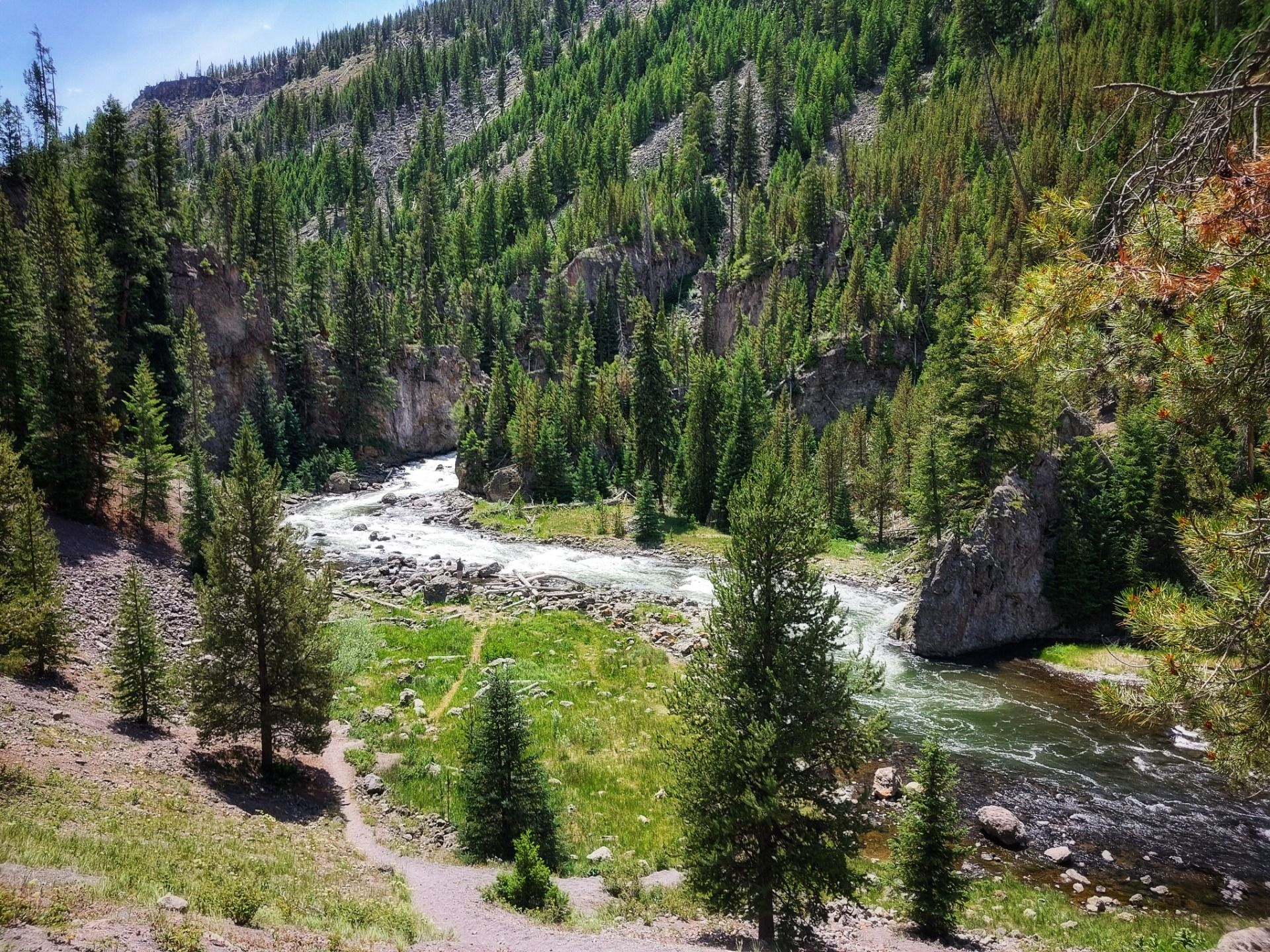 Also fuhr ich weiter und durchquerte das Hayden Valley, eine weite, offene Ebene, in der Bisons grasten und der Yellowstone River in sanften Kurven glitzerte. Das Hayden Valley ist einer der besten Orte im Park, um Wildtiere zu beobachten, besonders am frühen Morgen oder späten Abend, wenn Elche und manchmal auch Wölfe in der Dämmerung zu sehen sind.