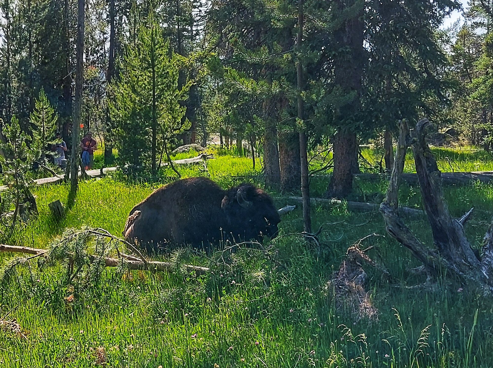 Ich war jedoch zu ungeduldig, um auf den nächsten Ausbruch zu warten, und wanderte stattdessen zu einem Aussichtspunkt in der Nähe. Auf dem Weg dorthin lag plötzlich ein Bison im Schatten eines Baumes, seelenruhig kauend.