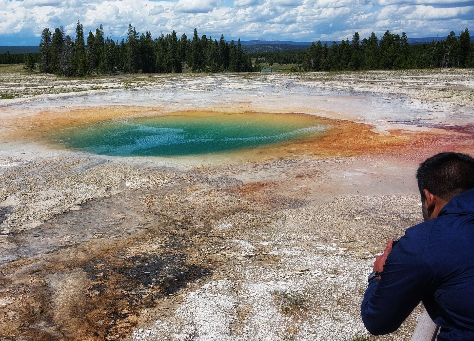 Mein nächster Halt war das Midway Geyser Basin, bekannt für das Grand Prismatic Spring, die größte heiße Quelle der USA. Aus der Ferne sah ich die leuchtenden Farben: tiefes Blau in der Mitte, umrandet von leuchtenden Gelb-, Orange- und Rottönen, die durch thermophile Bakterien entstehen. Ich zog meine Motorradstiefel aus und schlüpfte in meine normalen Schuhe, um gemütlich über die Holzstege zu laufen und dieses Naturwunder aus nächster Nähe zu betrachten, während Wolken von heißem Dampf über die Fläche zogen.