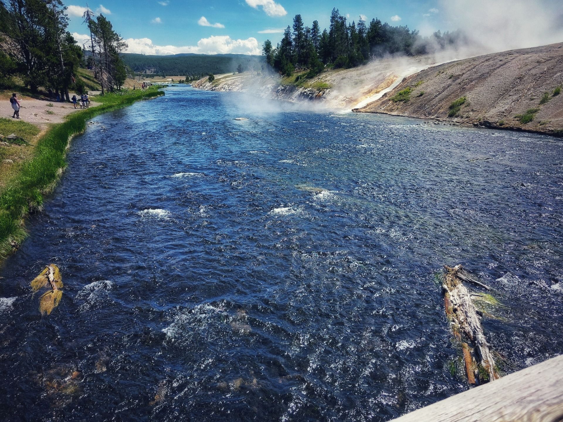 Mein erster Stopp war der Firehole Canyon. Hier rauscht der Firehole River durch einen rot leuchtenden Canyon, vorbei an Felsen, dampfenden heißen Quellen und kleinen Wasserfällen. Ich machte die ersten Fotos, während der Wind mir den Geruch von Schwefel in die Nase wehte.