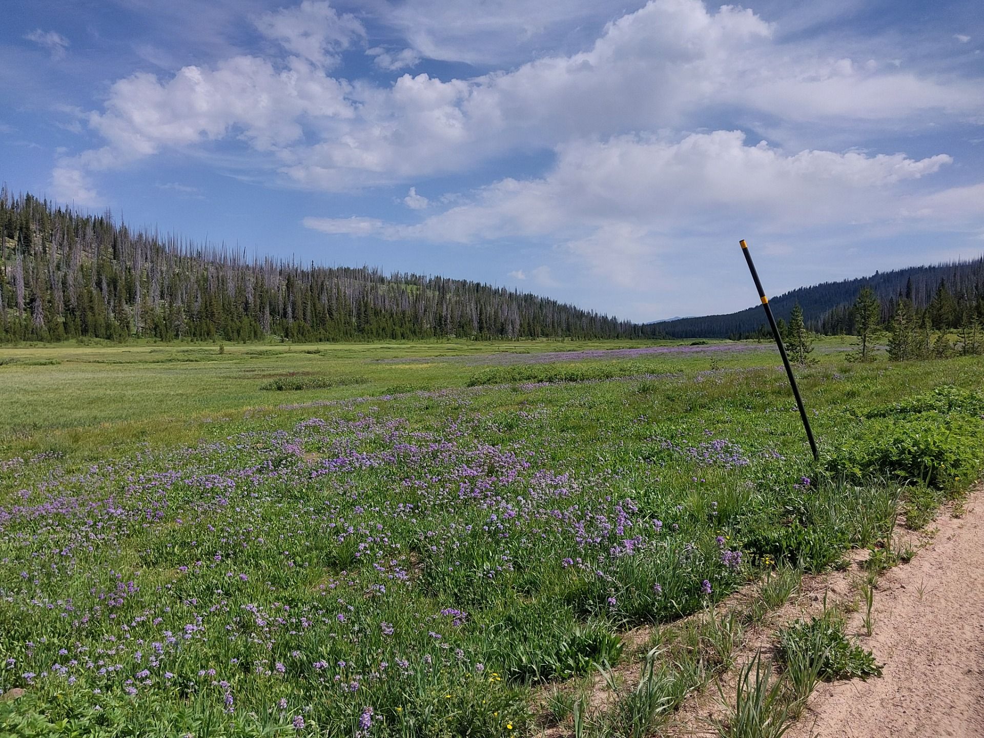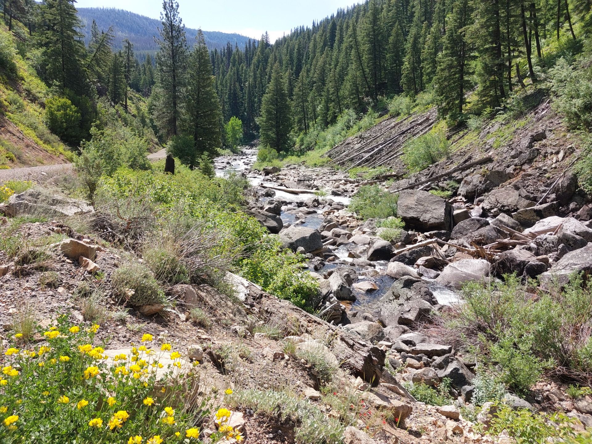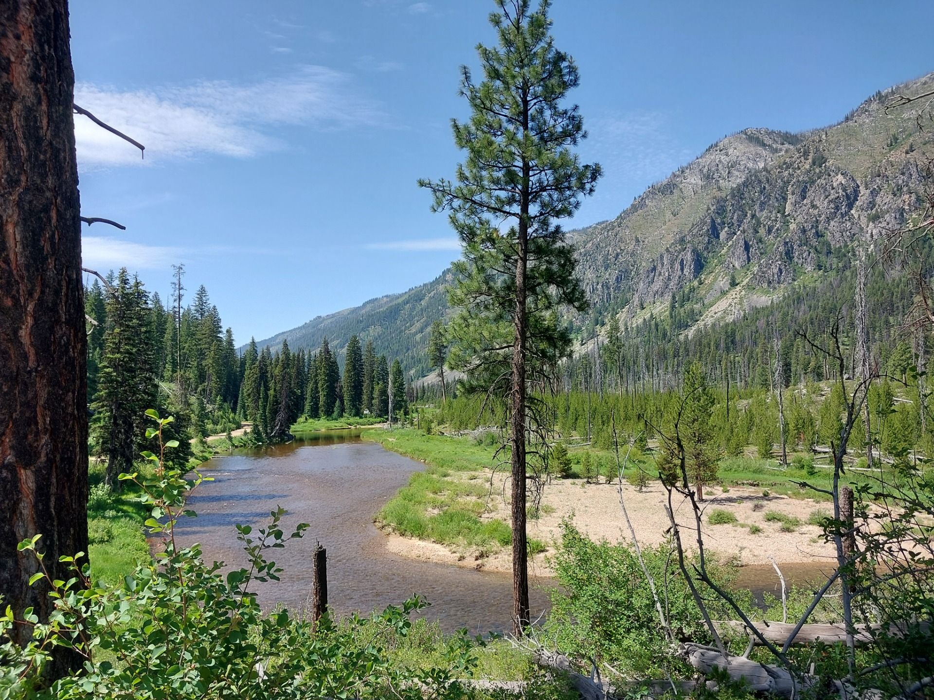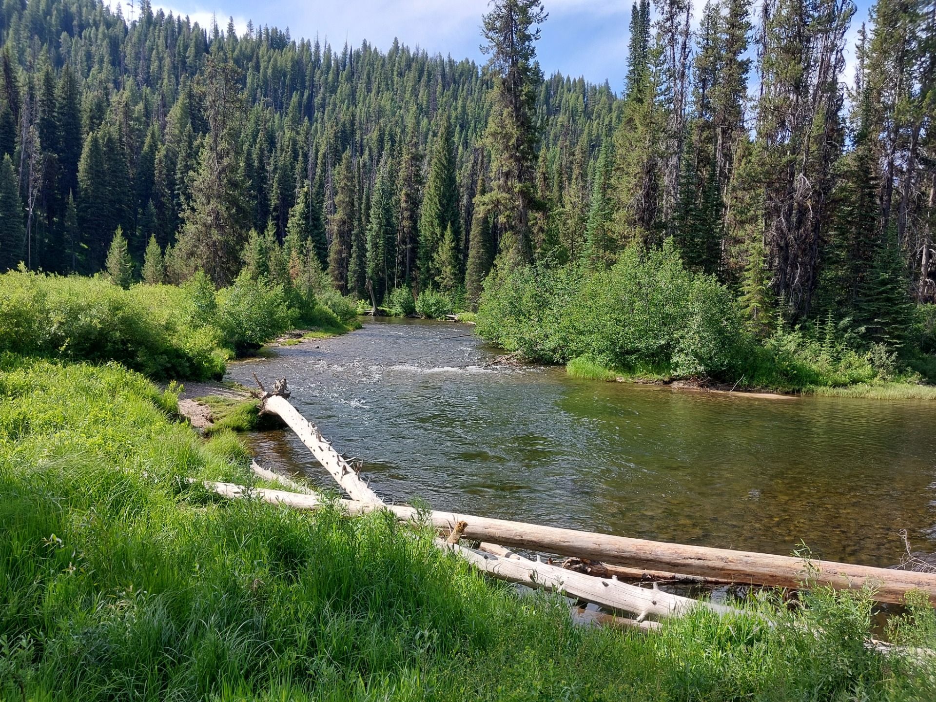 Danach wurde die Straße geradliniger, entlang des Johnson Creek, der sich glitzernd durchs Tal schlängelte. Die Landschaft hier? Offene Wiesen, gelb und grün getupft, gesäumt von Pappeln und Fichten, der Bach plätschert neben der Straße, während sich die Berge sanft im Hintergrund erheben. Es war so idyllisch, dass ich fast erwartet hätte, dass ein Elch vorbeispaziert.