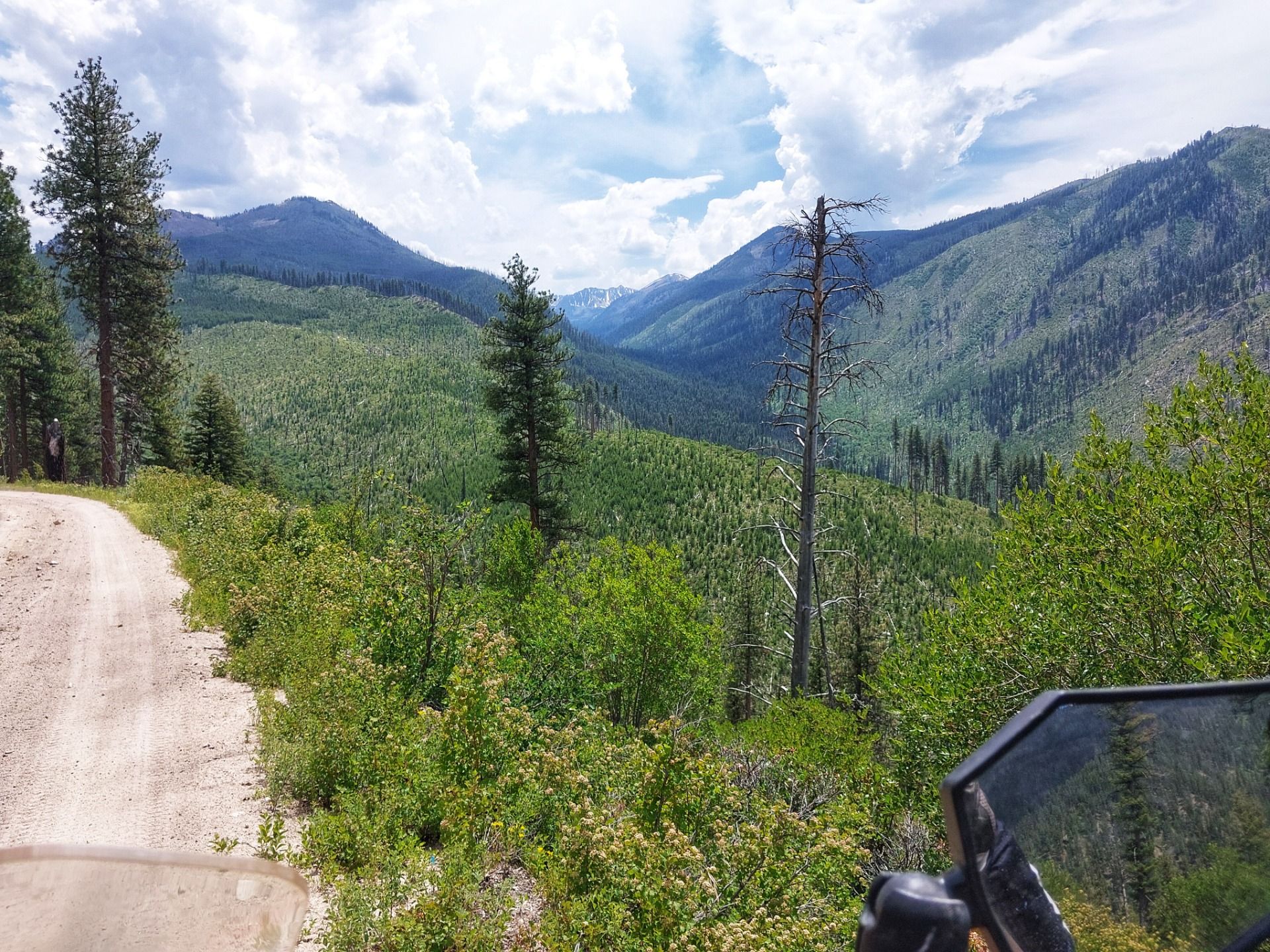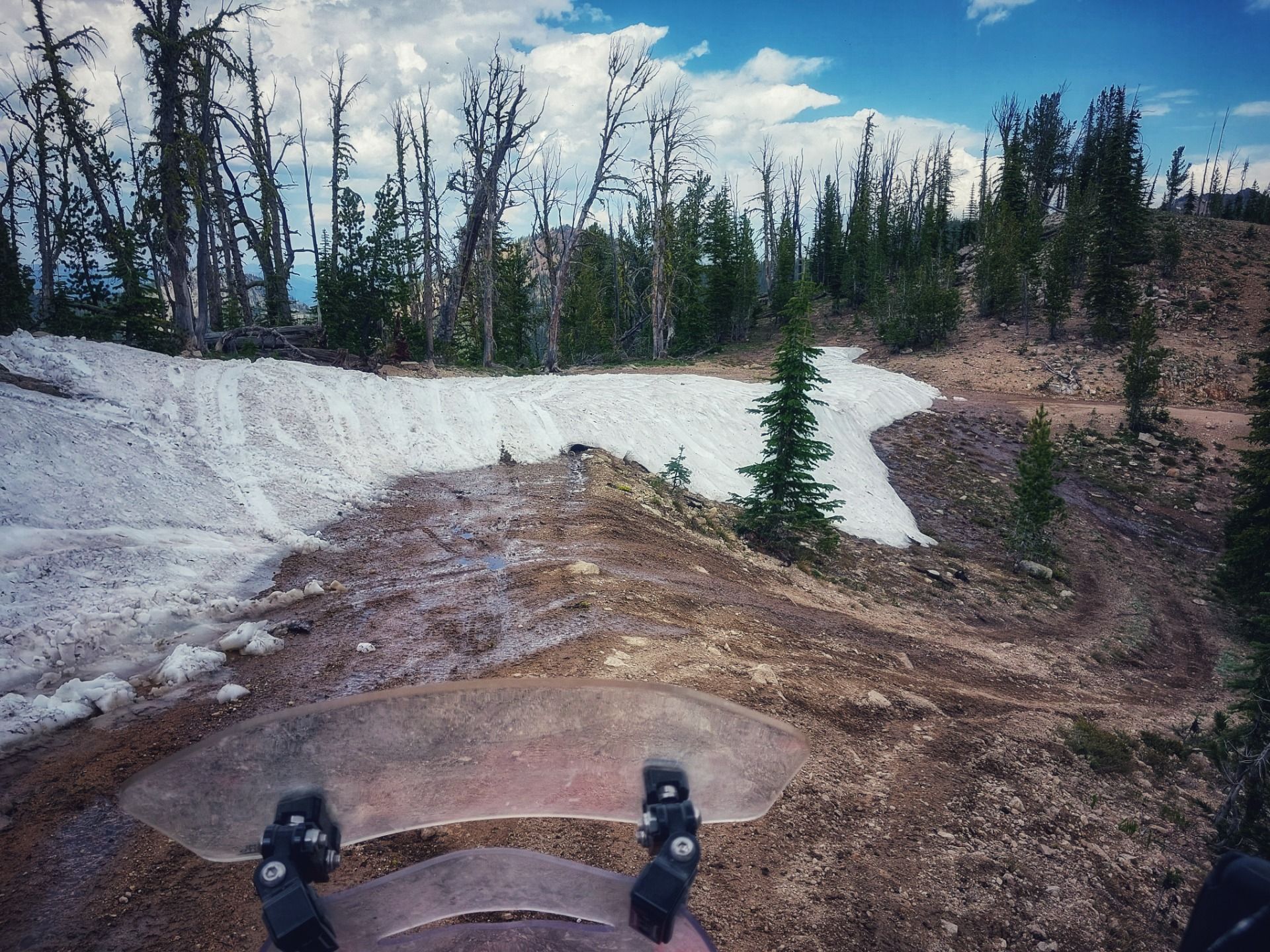 Die Hitze im Tal brannte bei 1500 m, aber ich machte weiter, kletterte mit meinem Motorrad zum Elk Summit Pass auf 2600 m, wo noch 1m Schnee auf der Straße lag und die Temperaturen deutlich frischer. Glücklicherweise konnte man rechts dran vorbei fahren.