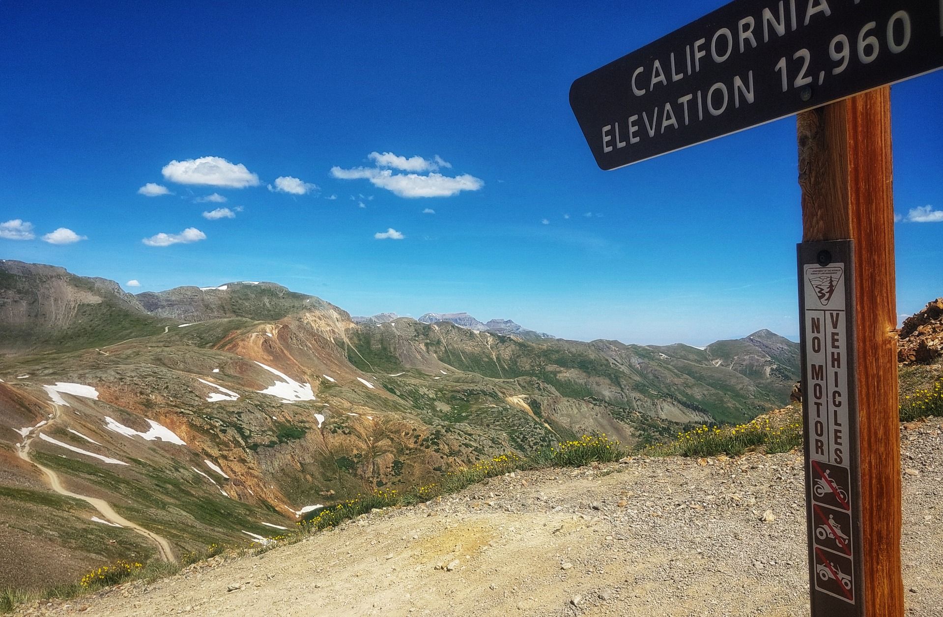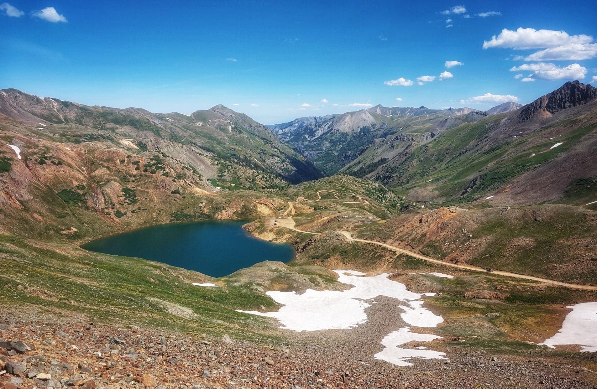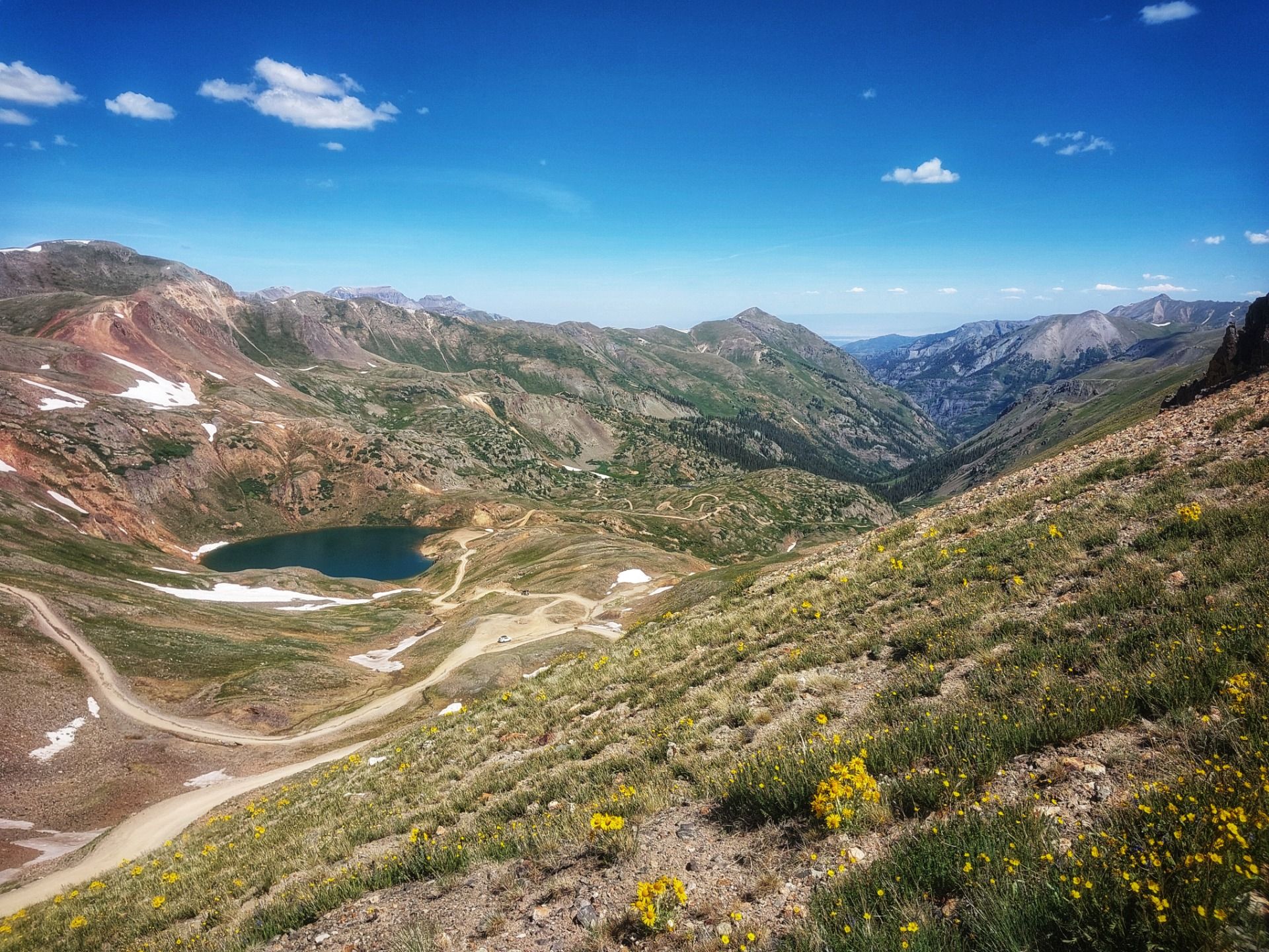 Man sieht hinüber zu den zerklüfteten Bergketten der San Juans, Täler voller grüner Wiesen, Schneefelder im Juli, weite Blicke in alle Richtungen – pure Freiheit auf 3.853 m.