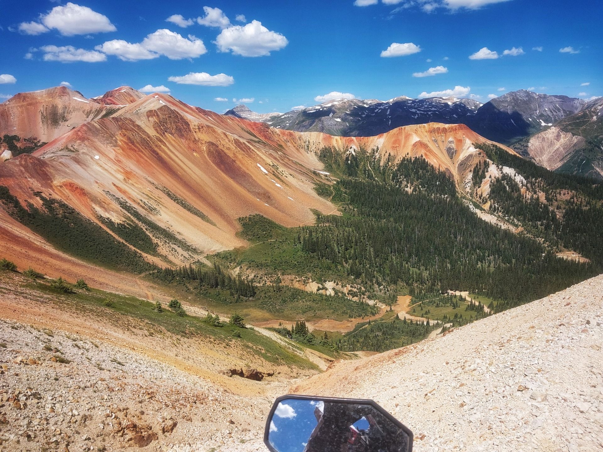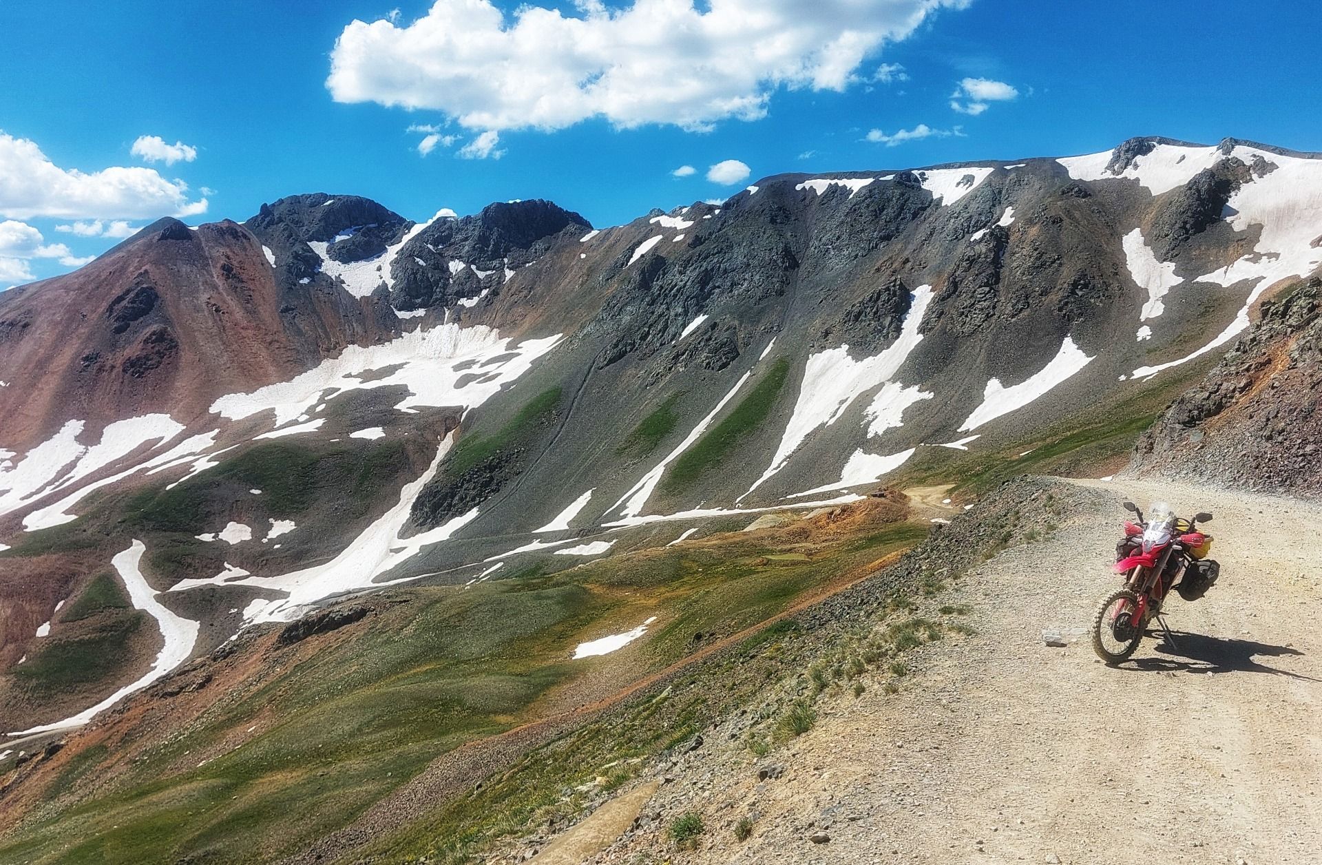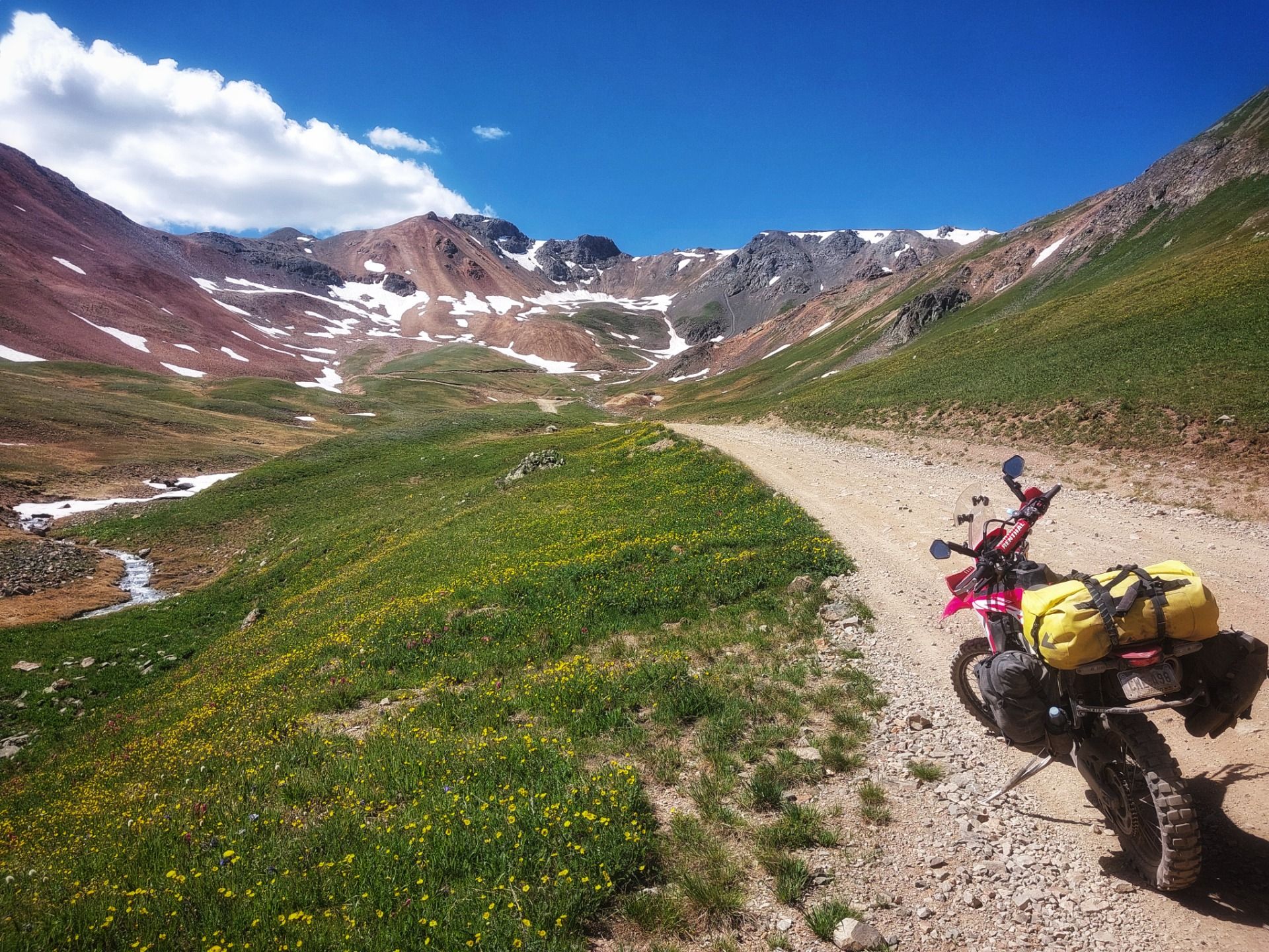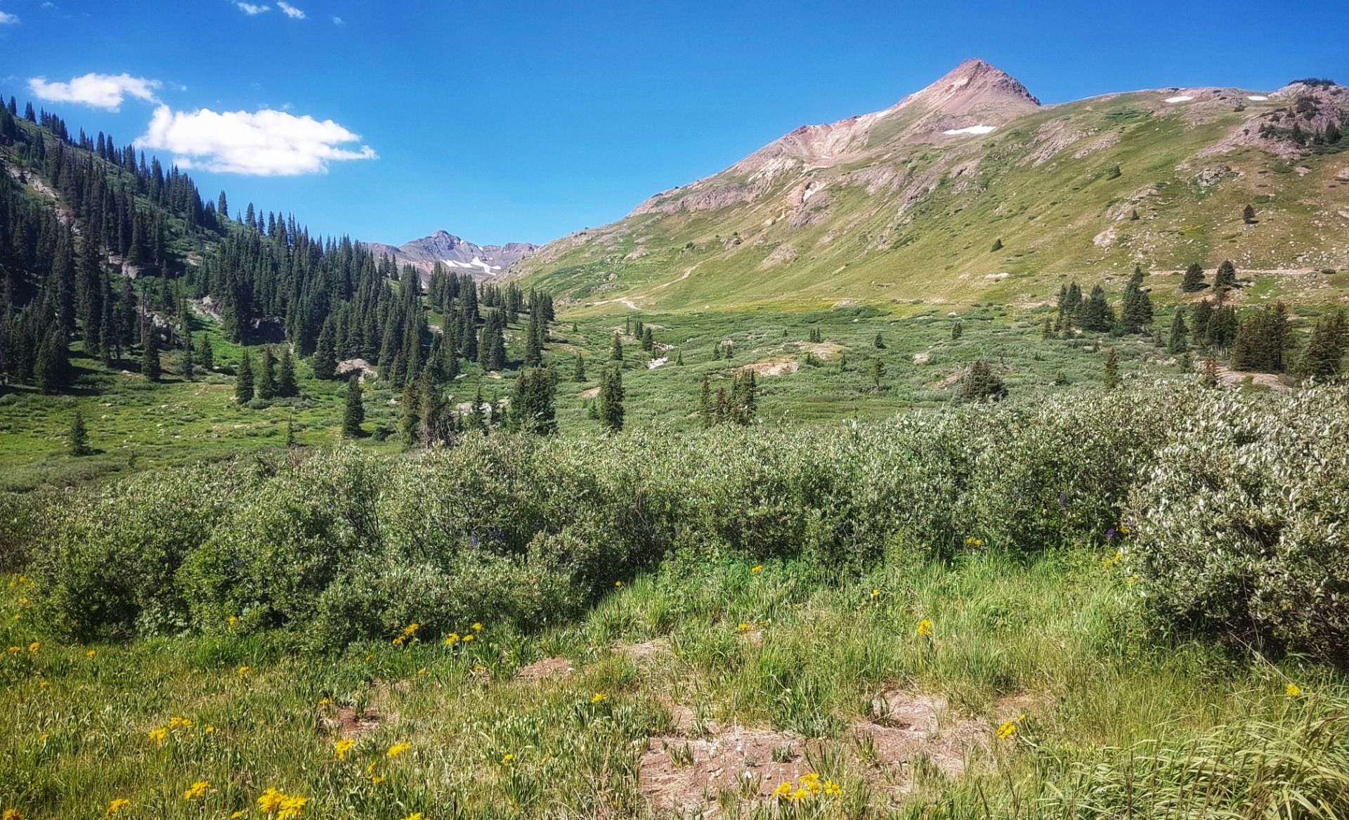 Man sieht hinüber zu den zerklüfteten Bergketten der San Juans, Täler voller grüner Wiesen, Schneefelder im Juli, weite Blicke in alle Richtungen – pure Freiheit auf 3.853 m.