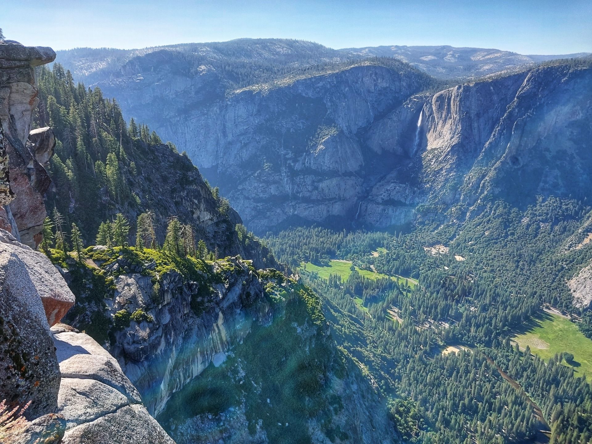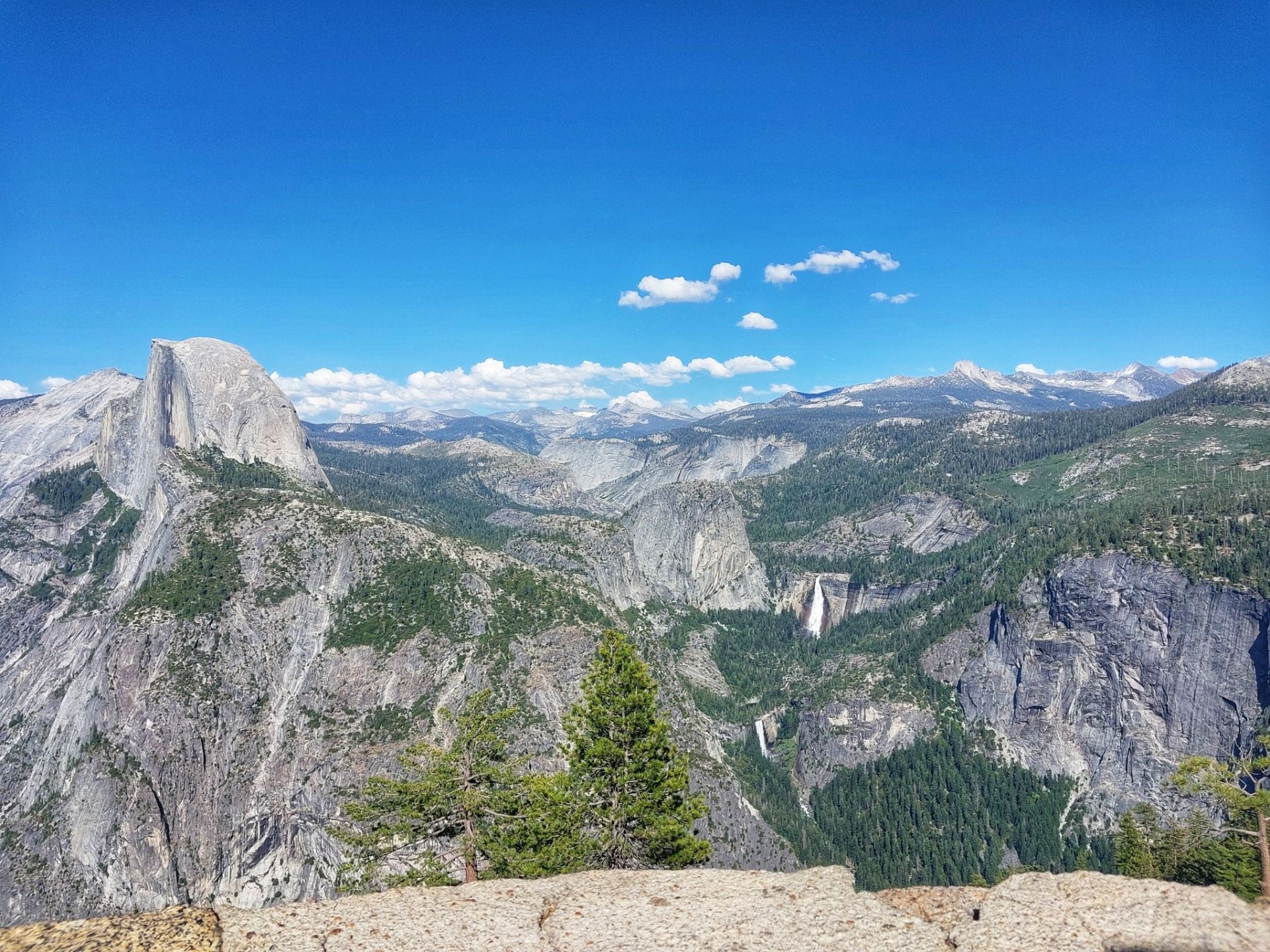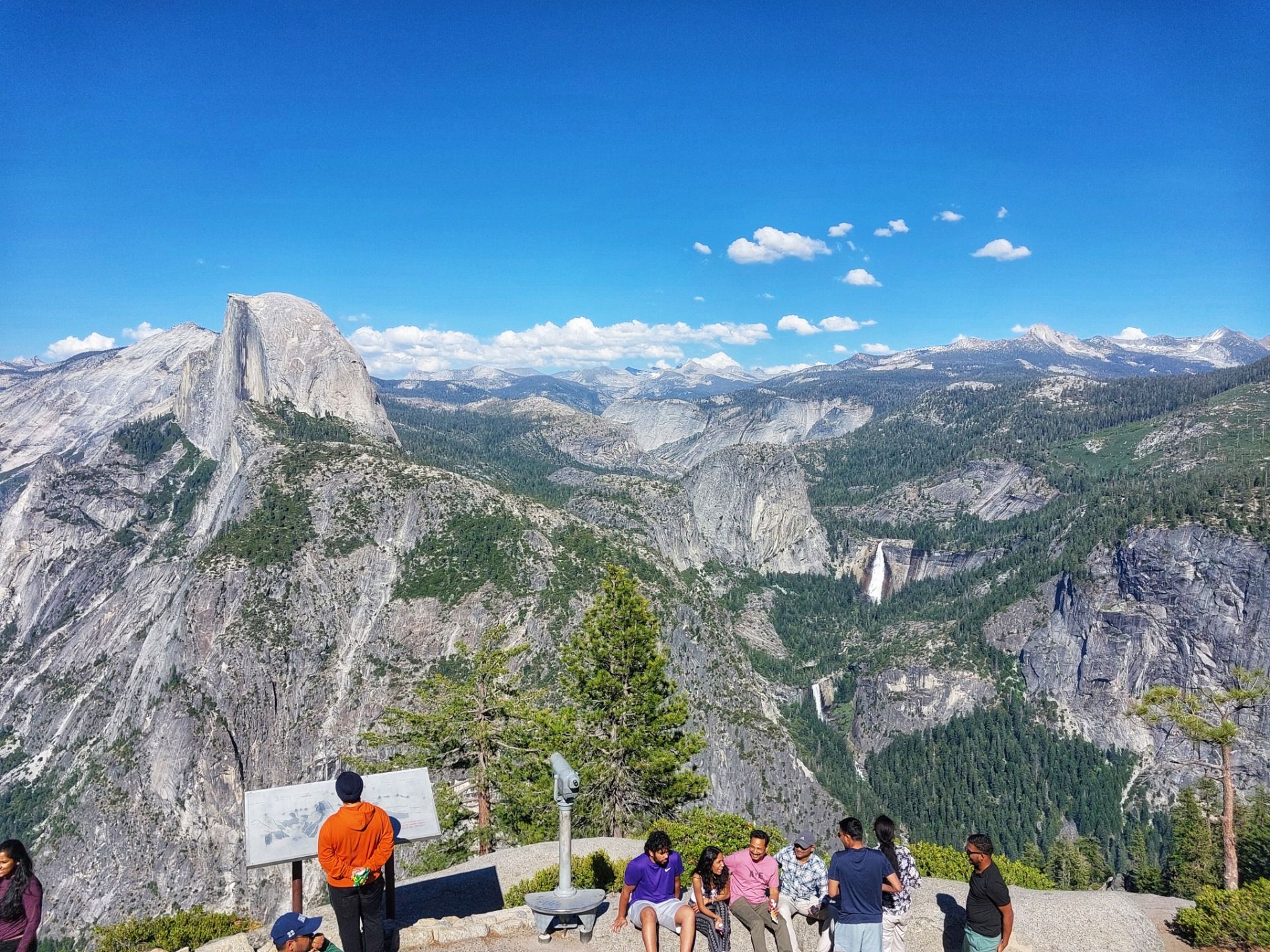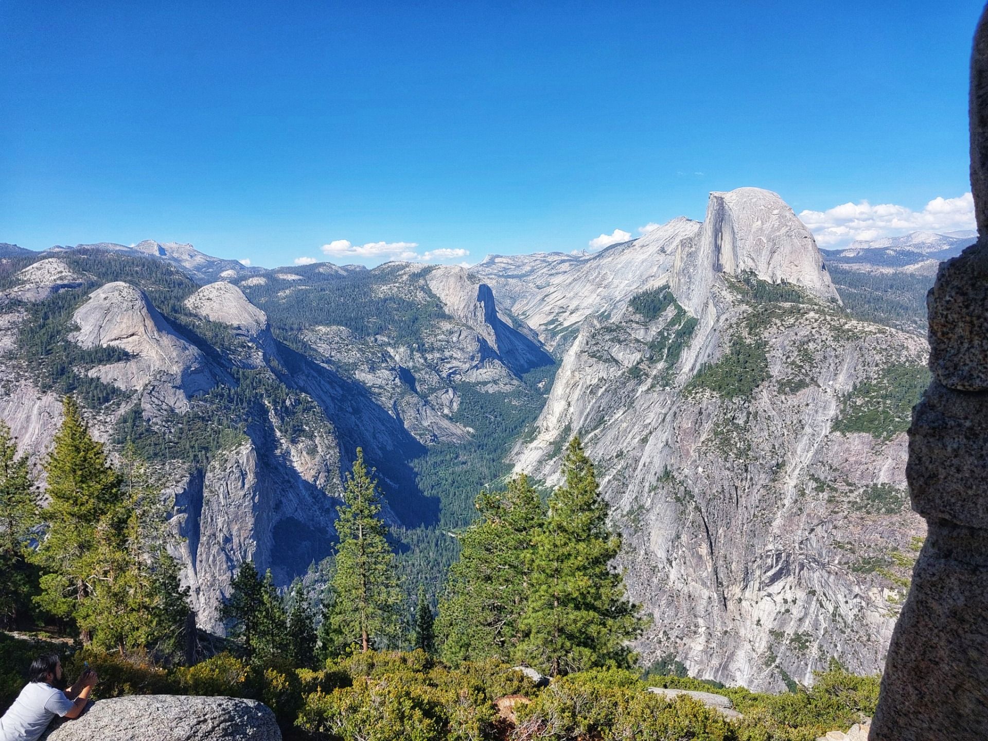 Spätnachmittags erreiche ich Glacier Point, 2.200 Meter hoch gelegen, mit Blick auf das Yosemite Valley, den Half Dome, und die Ferne. Ich bin sprachlos – und das passiert selten. Es fühlt sich an wie ein Traum, nur dass ich diesmal wirklich da bin.