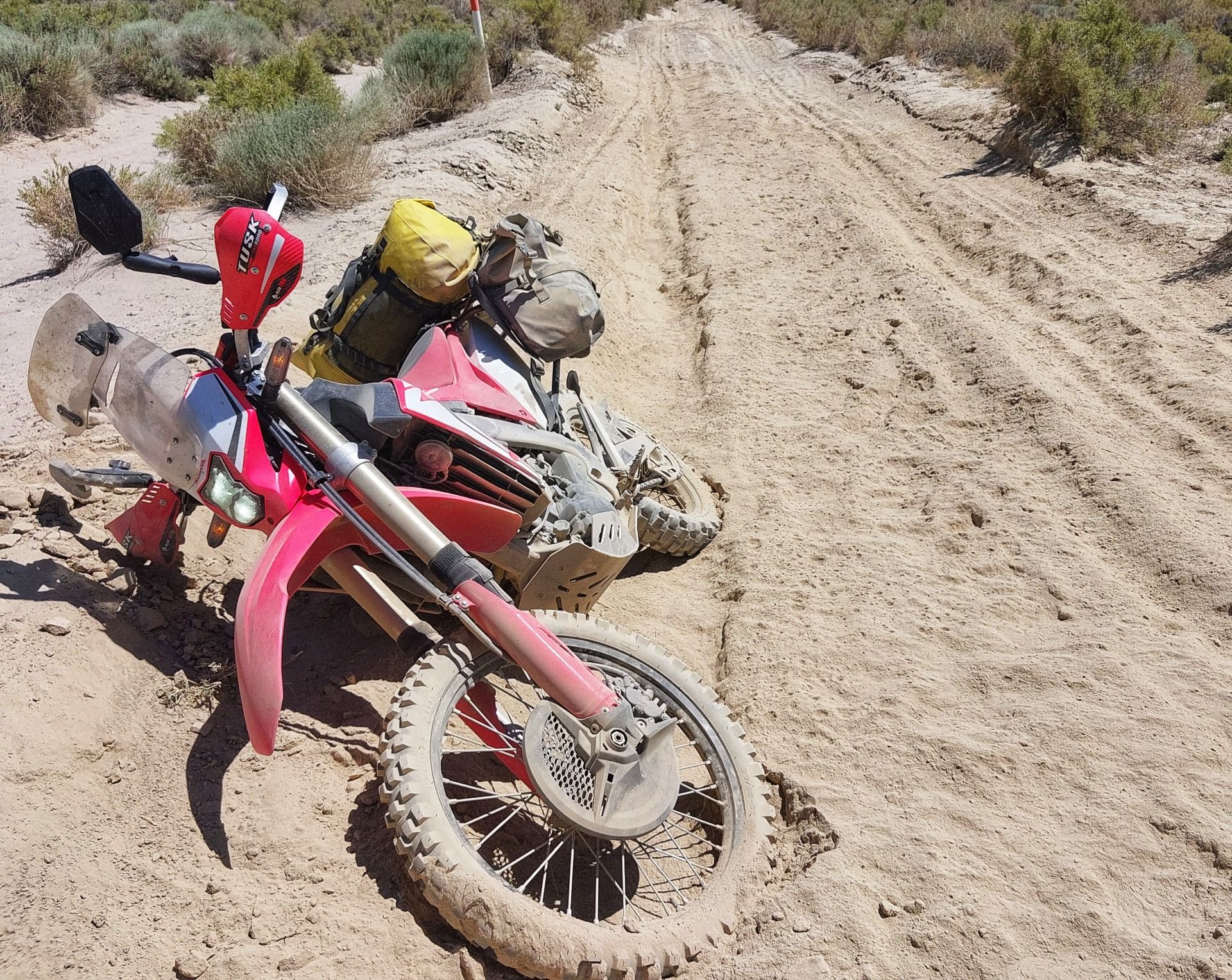 Sandexplosion! Ich verschwinde in einer Staubwolke, die selbst Wüstenfüchse beeindruckt hätte. Ich weiß nicht mehr, wo oben und unten ist. Aber ich lebe und bin unverletzt. Und das Motorrad auch – bis auf einen verbogenen Handschützer.