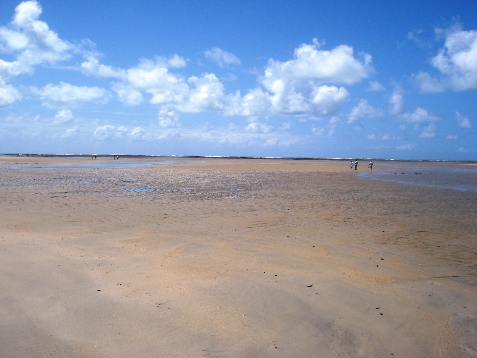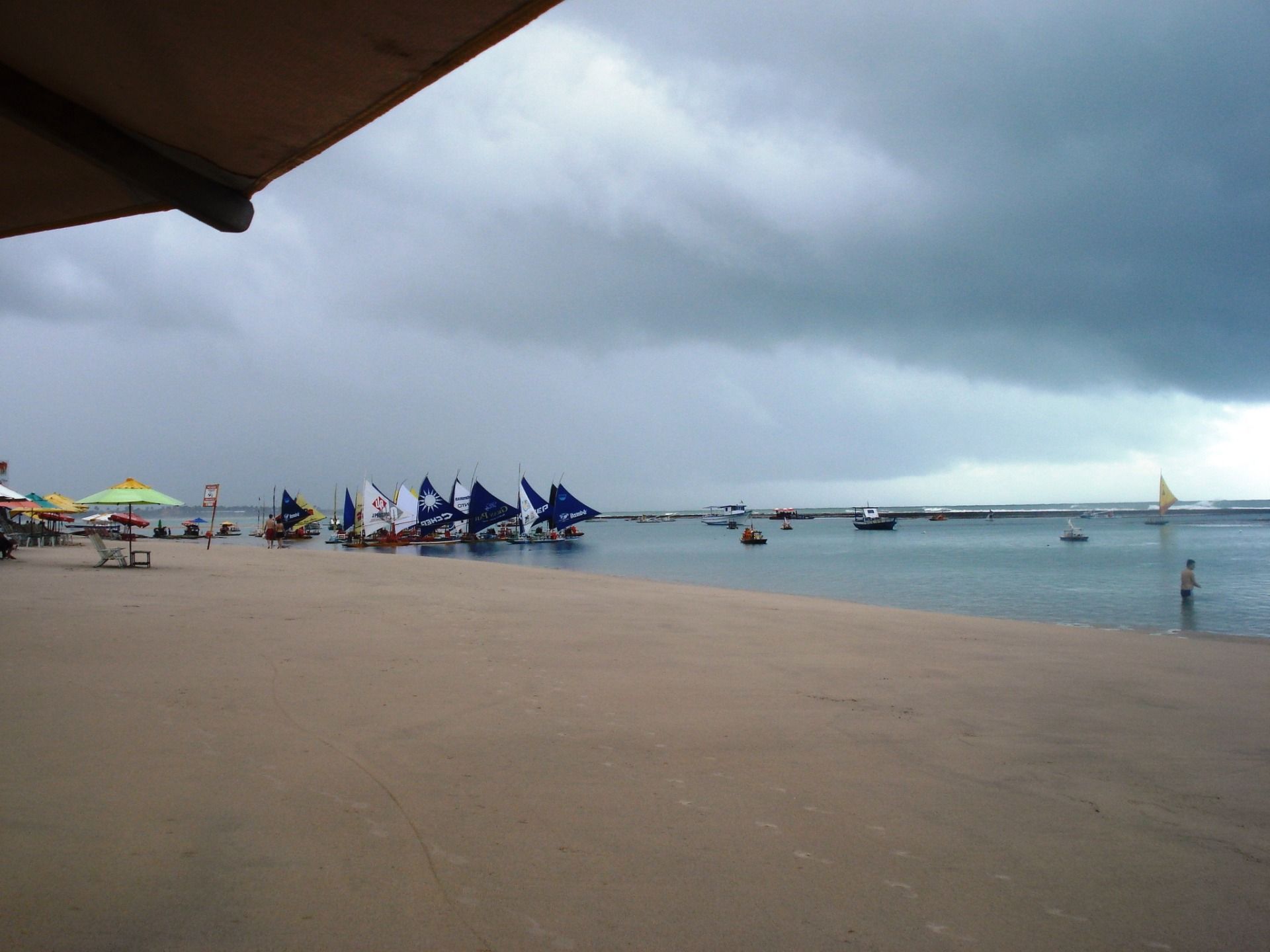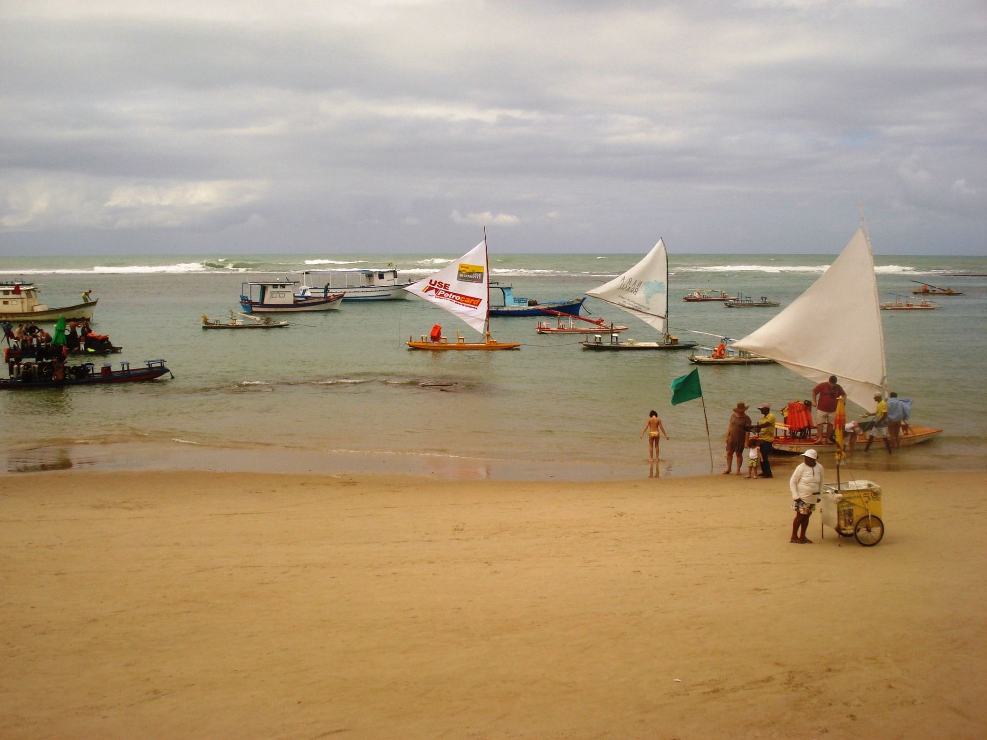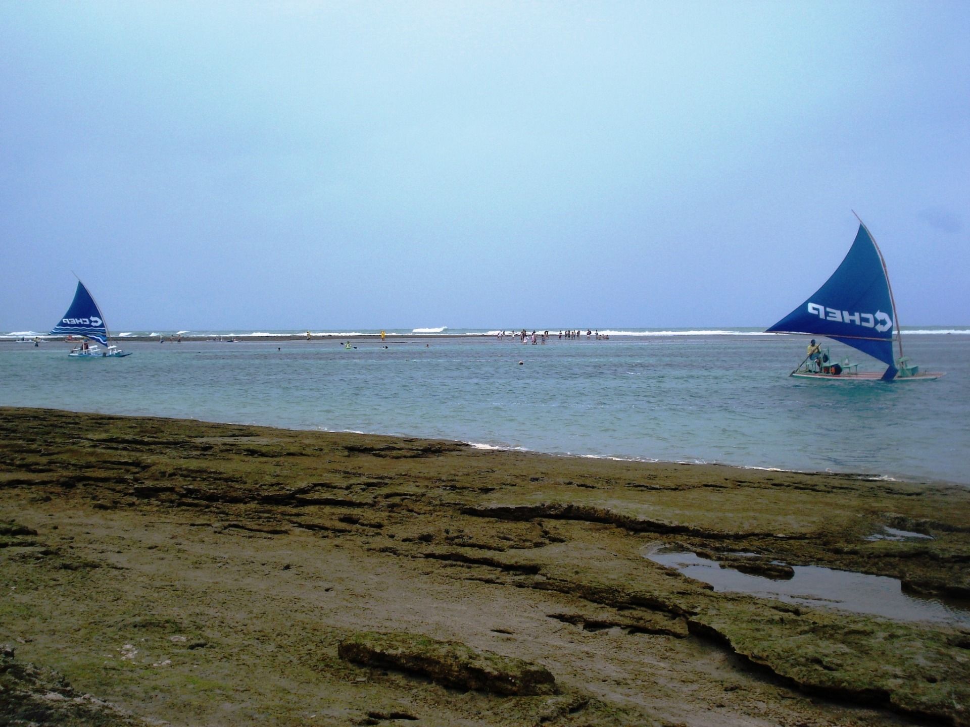 Porto de Galinhas, located about 70 km from Recife, capital of Pernambuco, has as its main attraction its beach with many palm trees and beautiful natural pools that form about 100 meters from the shore when the tide drops. There many people work offering rides in rafts (wooden boats with sail) to tourists.
