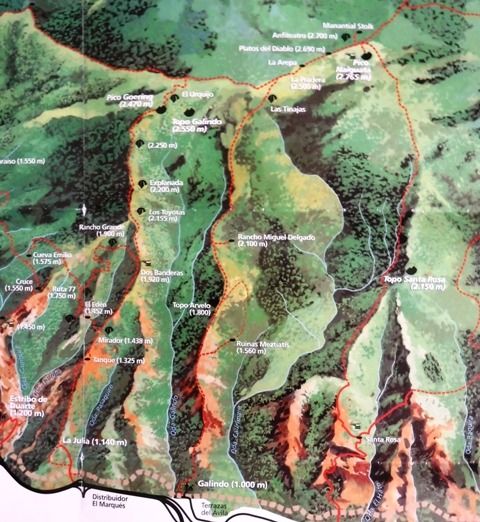 Photo: Map of the route to Naiguatá peak, down left the starting point La Julia and in red points the route