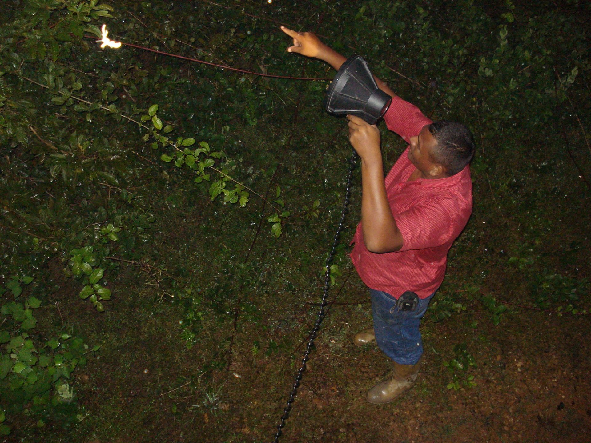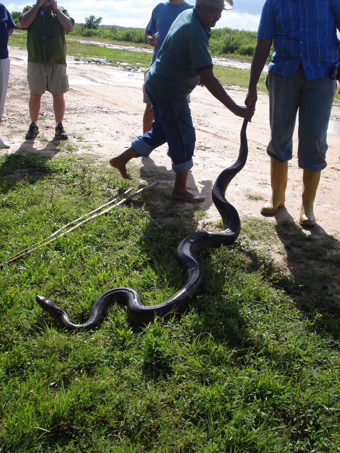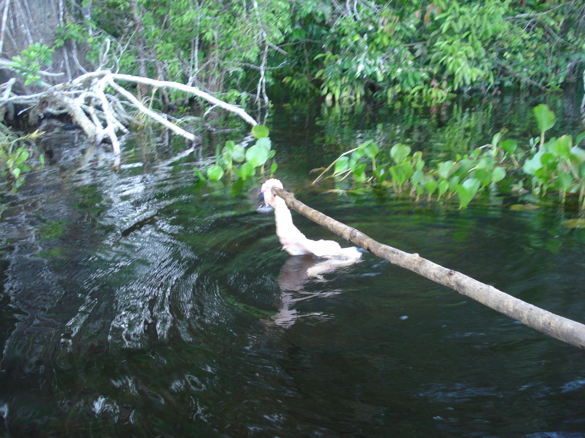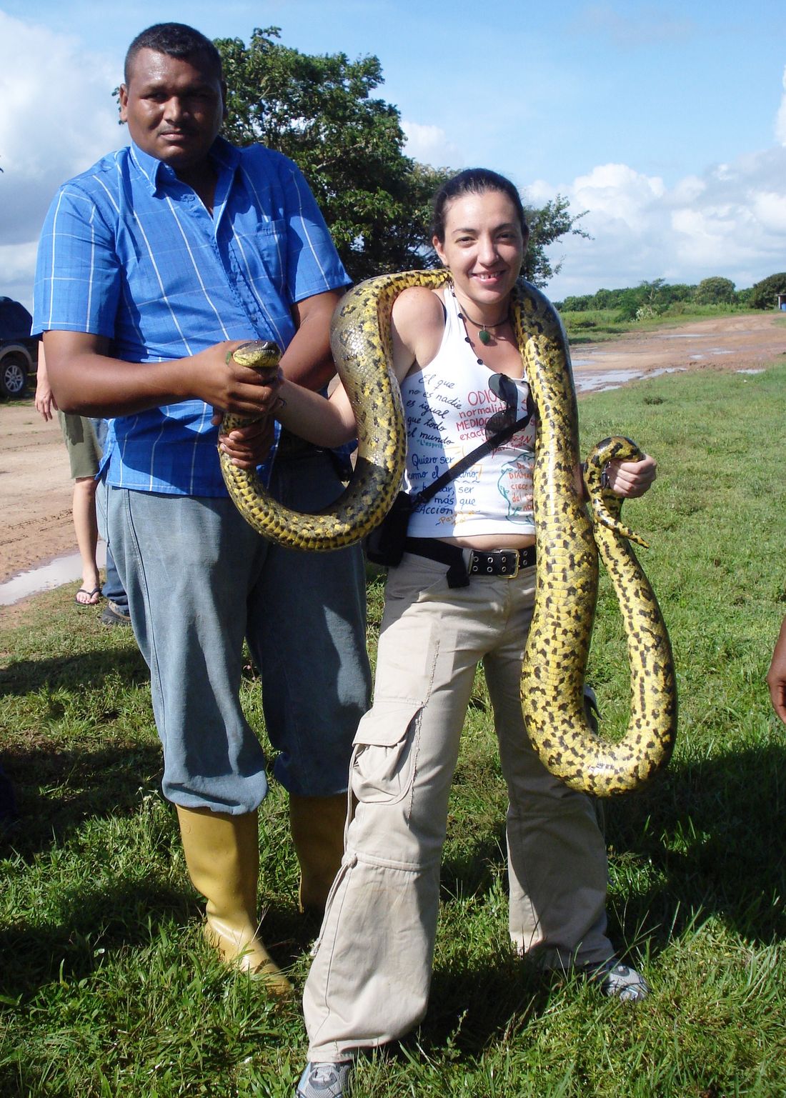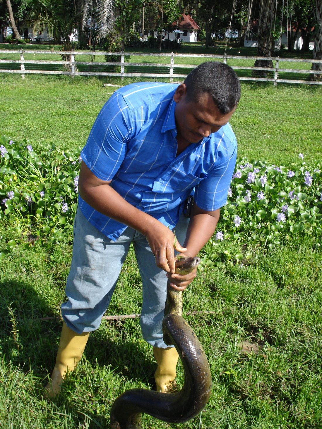 He took us to a small pipe near the camp and with a stick he began to move the vegetation, suddenly he put his hands there and began to pull something, it was the tail of the anaconda. He said if we wanted to pull it too and some of us accepted. I had never touched a snake, it is very soft, silky and cold, this specimen measured just over three meters.