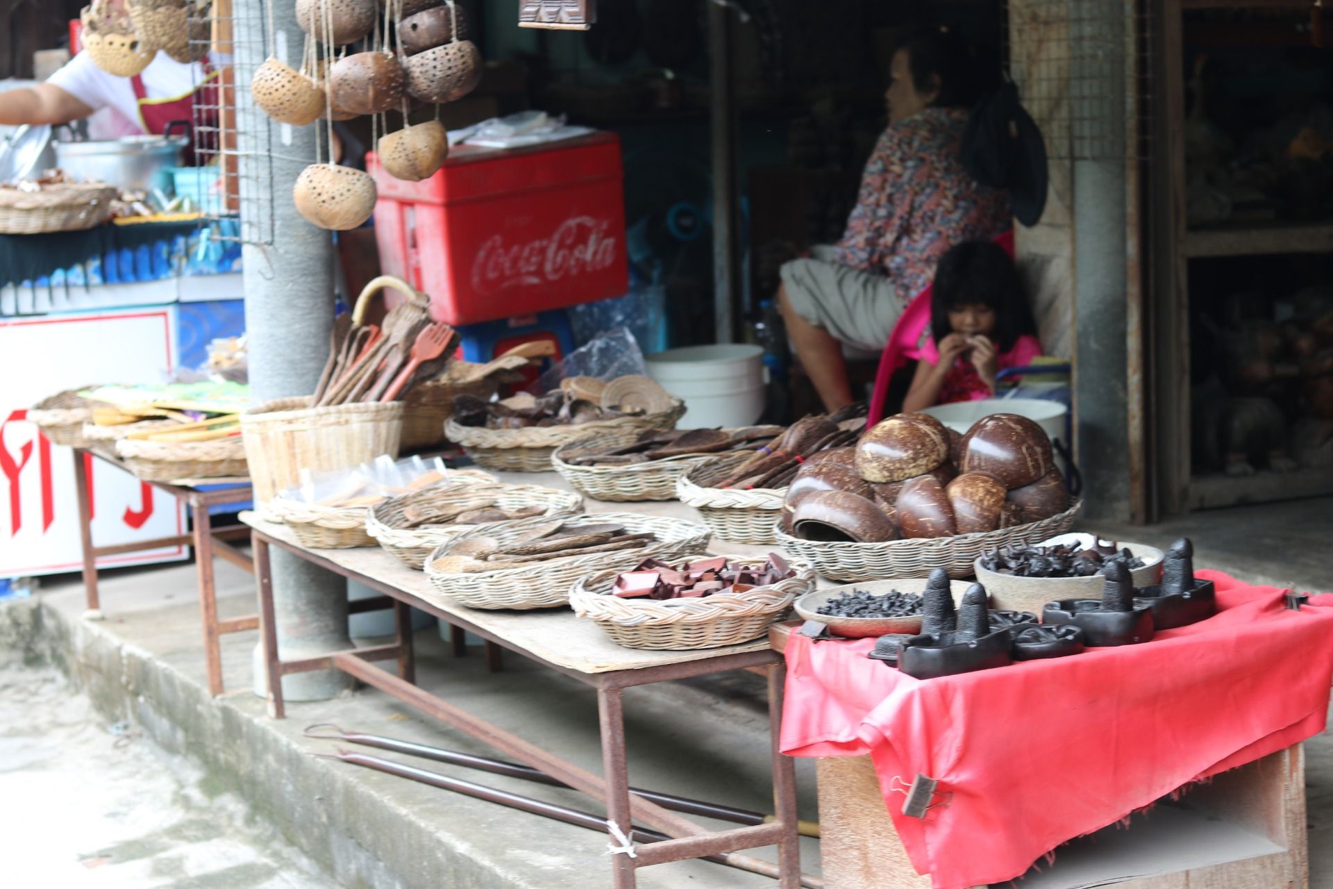เมื่อเดินไปถึงด้านในค่อยโล่งใจหน่อยมีผู้คนมีแม่ค้าขายกาละแม แม่ค้ามักจะเรียกให้ชิมกะละแมแทบทุกร้าน เลยเดินไปก็เกรงใจ สีติดมือไป ร้านรับถุงถุงละ 35 บาท นับได้ว่าร้านที่เปิดขายของฝาก ขนมกาละแมน่าจะ 4-5 ร้าน แม่ค้าใจดีเชียร์ทุกร้าน กำลังห่อกาละแมใส่ถุง อยู่เลยค่ะ บางร้านก็มีใครไอ้ติมคู่ไปด้วยพร้อมกับเครื่องดื่มเผื่อนักท่องเที่ยวจะกระหายน้ำ น้ำเปล่าขวดเล็กขวดละ 20 บาทส่วนไอศครีม ตักโคนละ 30 บาท เด็กๆก็สั่งกินกันเพราะด้วยอากาศที่ร้อน เดินลงหาด มีร้านของฝากด้วยนะคะ ทำด้วยแก้วชิ้นเล็กชิ้นน้อยเป็นรูปสัตว์ต่างๆน่ารักดีค่ะ และก็ยังมีของฝากอีกร้านนึงซึ่ง ขายไม่เหมือนกันค่ะร้านนี้เป็นกะลามะพร้าวในรูปแบบต่างๆ ถ้วยชามช้อน หมวก เป็นจำพวกของใช้ที่ทำด้วยกะลามะพร้าว