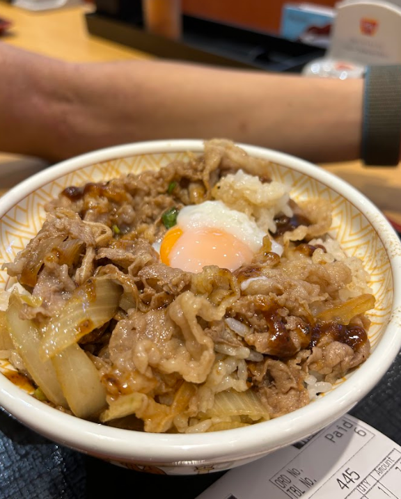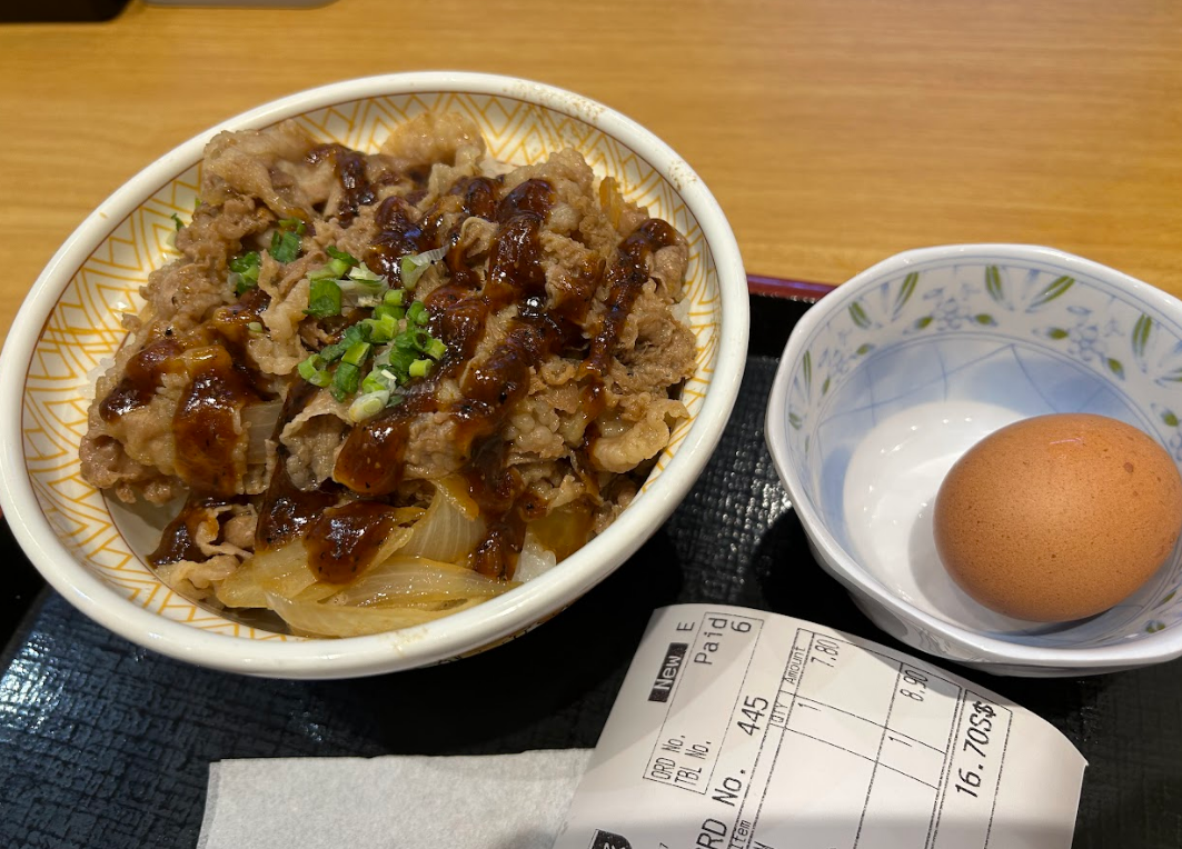 Sean ordered a gyudon topped with black pepper sauce and a half boiled egg as well.Â