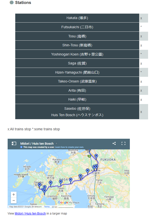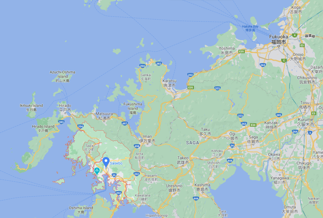 So the thing about this train is it's a limited express train that travels from Hakata, Fukuoka all the way to Sasebo! It's more than 100km away by car so trains are definitely essential! Here's what it looks like on the map: