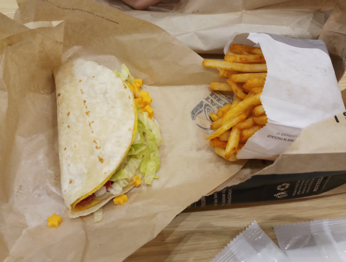 We decided to try this special taco with a soft shell wrapped around a hard shell one and it was actually pretty good! The fries were nice and crispy too! The vegetables and the star-shaped cheese was a little cold though, and the cheese tasted a little fake, but other than that it was still a pretty decent snack!