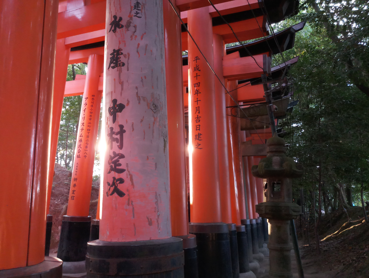 This is the entrance to the torii gate-covered hiking trail, which starts with two dense, parallel rows of gates called Senbon Torii ("thousands of torii gates"). The torii gates along the entire trail are donations by individuals and companies, and you will find the donator's name and the date of the donation inscribed on the back of each gate. The cost starts around 400,000 yen for a small sized gate and increases to over one million yen for a large gate. (Source: Japan-guide)