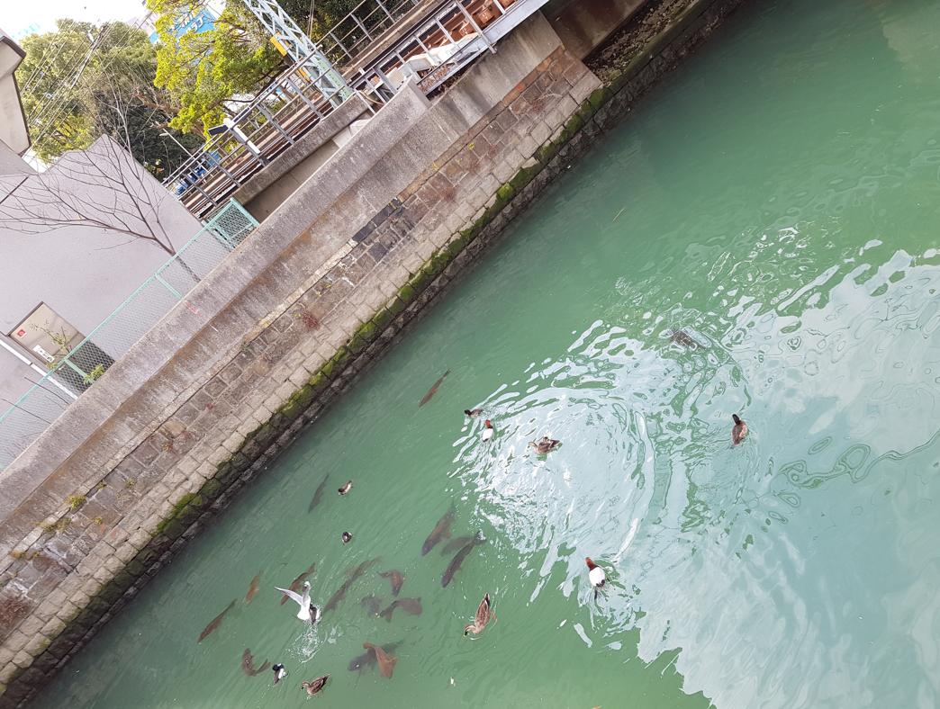 In the nearby canal we also saw a lot of fish and ducks all gathered in one area for some reason. I can't tell if it's the water being clean that we could see the fish so clearly or is it just because the fish is dark against the green water.