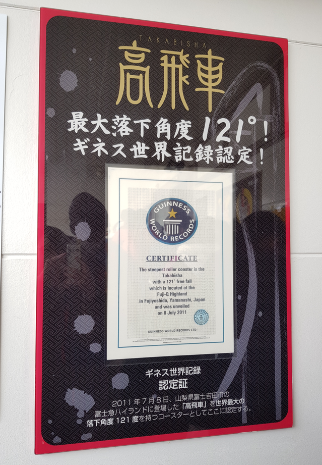 Takabisha holds the record for the one of the steepest roller coasters, with a 121° freefall! It has seven twists, falling sharply with a maximum drop angle of 121 degrees, sudden rise while looking at the sky, temporary stop in fall position, and frighteningly looks like this: