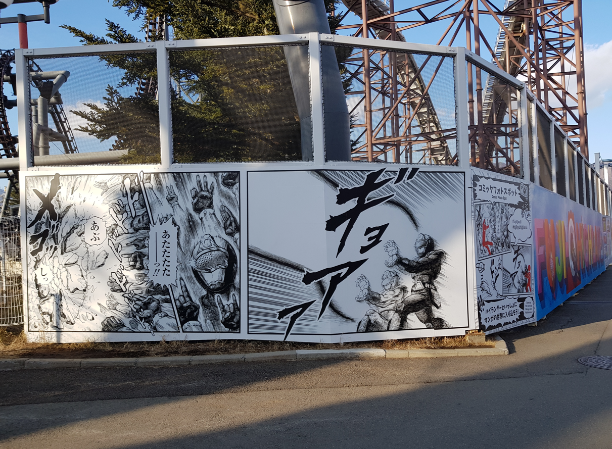 After that snack we went to walk around some more and saw this ride that was closed off. Maybe they were renovating it or something but the boards that blocked it off were so cool it looked like an actual manga!
