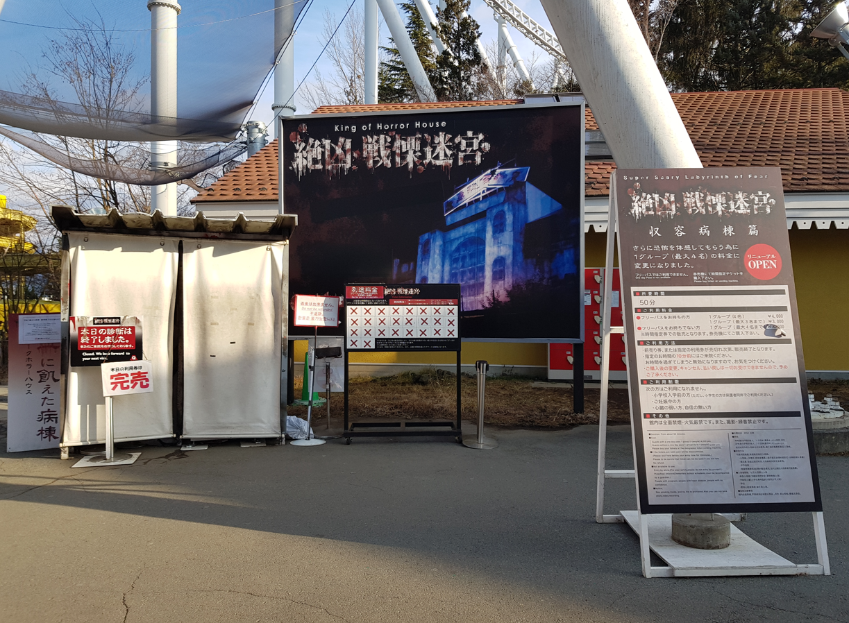 Neither Sean nor I are a fan of horror or scary things in general so there was no way in hell we'd ever set foot in there. Especially since it's a maze full of trap rooms, dark corners and pitfalls! I read that the designers combined primal horrors like darkness and jump scares as well as deeper fears like disease and death to really capture the terror and promise a thrilling experience akin to "horror harassment". (Source: jpninfo)