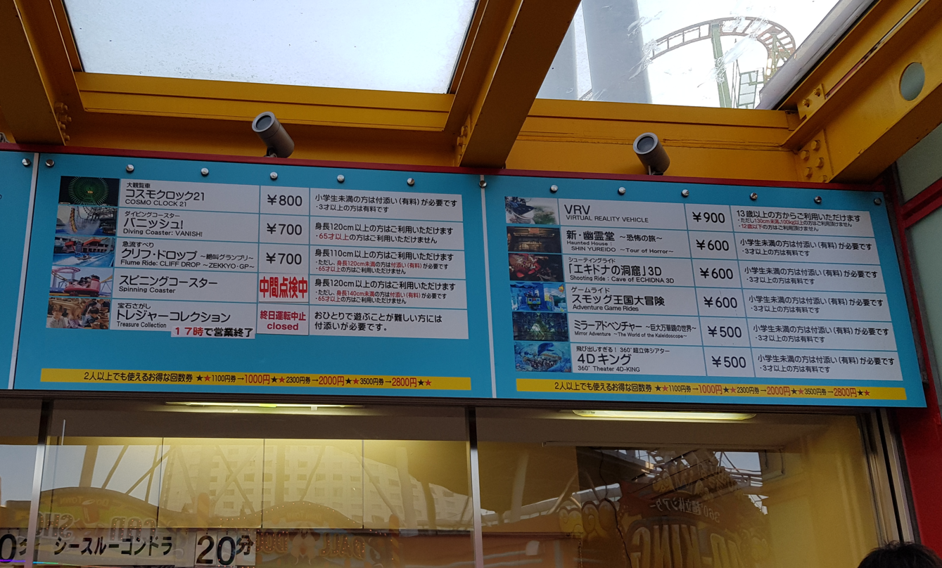 There are however discount books of tickets that you can buy if you plan to try a lot of rides. For example you can buy a 5,000 yen discount ticket book for just 4,000 yen! That's more convenient if you're going on a bunch of rides. Here's a closer look at the pricing for the rides.
