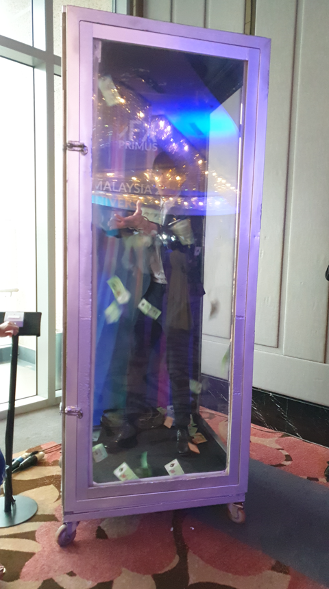 And this money grabbing booth where you're in a wind tunnel-like box and you have to grab as much money as you can. I didn't try though since I was wearing a dress so Sean went to give it a go. There wasn't much cash left though so it was kinda difficult to get anything.