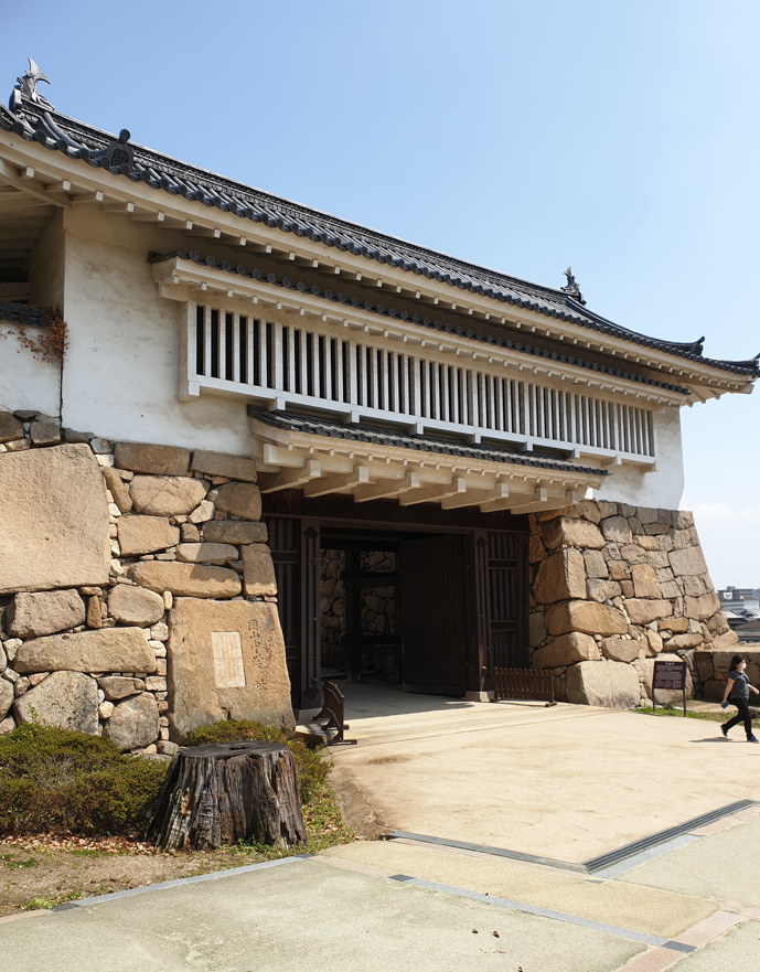 According to Wikipedia, the main tower was completed in 1597, destroyed in 1945 and replicated in concrete in 1966. Two of the watch towers survived the bombing of 1945 and are now listed by the national Agency for Cultural Affairs as Important Cultural Properties.