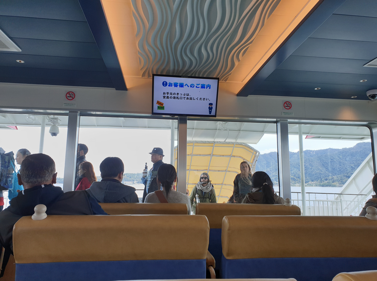 But it did get kind of stuffy and cramped with so many people and little ventilation so we headed outdoors to take a look especially when we were arriving at the island. You could actually already see the famous giant torii gate in the distance already as we were approaching!