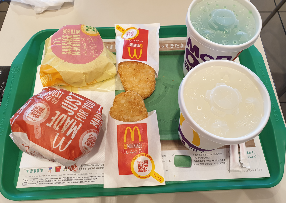 We ordered two breakfast burgers but since McDonalds Japan doesn't have Milo like we do here, we got different drinks!