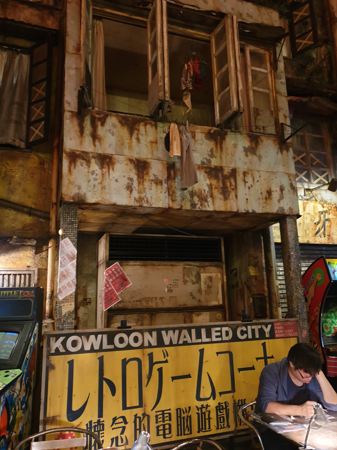 They even had this sign to show that it was indeed inspired by the Kowloon Walled City in HK, which was originally a Chinese military fort that turned into an ungoverned and densely populated Chinese enclave in 1898 and even more so during WWII. From the 1950s to the 1970s, it was controlled by local triads and had high rates of prostitution, gambling, and drug abuse. (Source: Wiki)