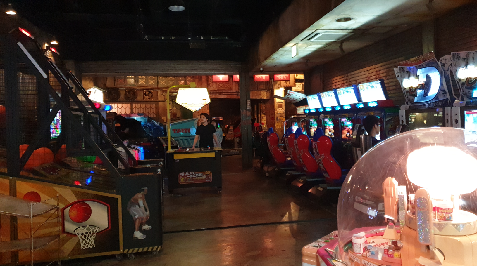 When we took the escalator up it wasn't so scary anymore because we arrived at the arcade! The walls, floor and lighting were still on-theme with the whole run-down dystopian look so most of the lights were from the many different arcade machines in there. Here's another video!