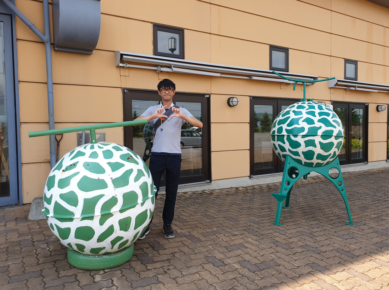 After taking a quick look, we left the souvenir shop while trying to avoid the sun since it was past noon and really warm out. And we saw these huge melon sculptures outside the restaurant so we had to take some pics with it!