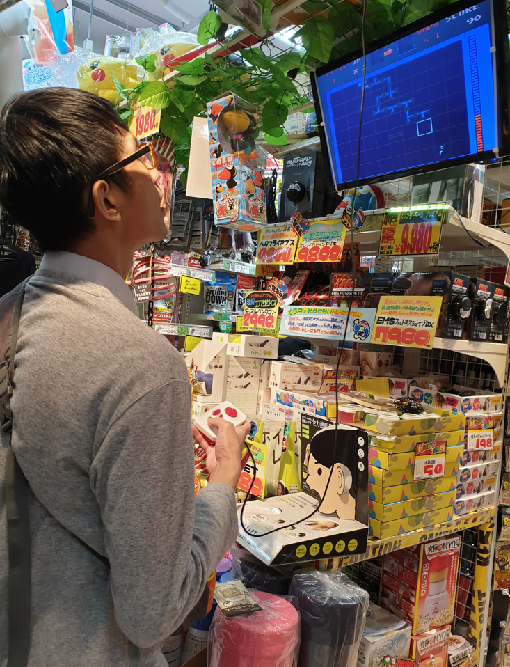 Sean tried to play this Famicom game they had on display. I'm not sure what the game was called but it's one of those puzzle games where you connect the pipes from one end to the other.