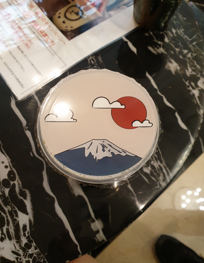 The shop did look really nice though and their couch was quite comfortable so we could rest our feet after our walk. The top of the bubble tea was this very nice and simple Mt Fuji art which I thought was really cute.