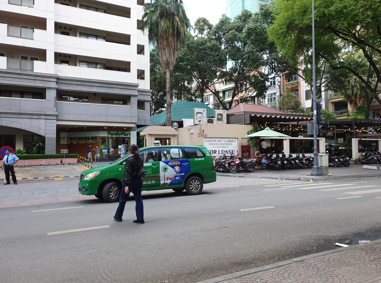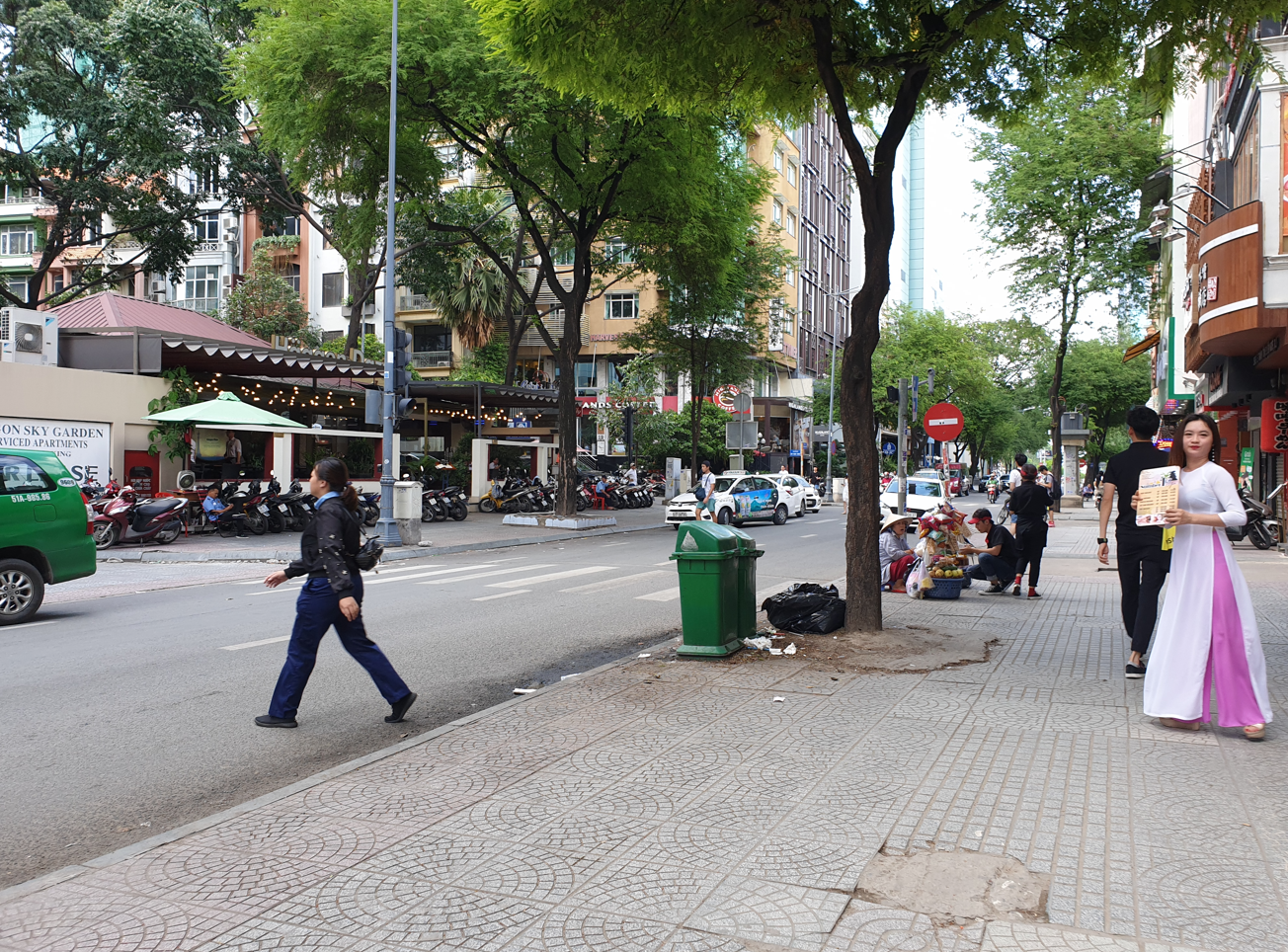 There was a lady wearing traditional Vietnamese wear, or Ao Dai on the street probably advertising some wellness service like a massage parlour.