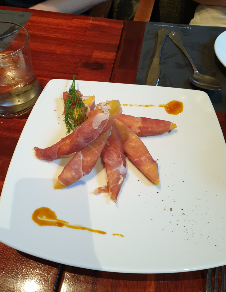 We ordered a couple of dishes to share between the 5 of us, starting with this manga parma ham wrap appetiser: