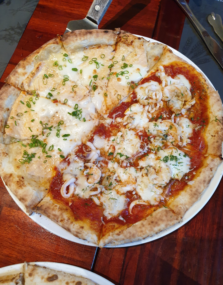 We also ordered half cheese, half Smoked Cheese Seafood Spicy Tomato Sauce, which I wasn't a big fan of since I don't really like seafood on pizza.