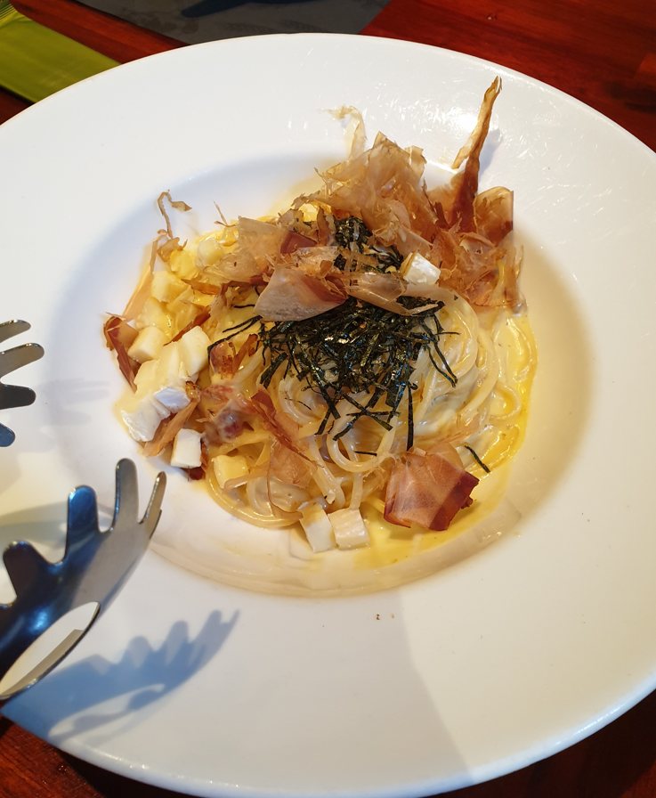 And of course Sean ordered the carbonara, which is their Japanese carbonara with homemade camembert topped with bonito flakes. I'm not sure what exactly made this "Japanese" per se but I guess just the use of bonito flakes and seaweed? I mean it was an interesting combination and still tasted good.