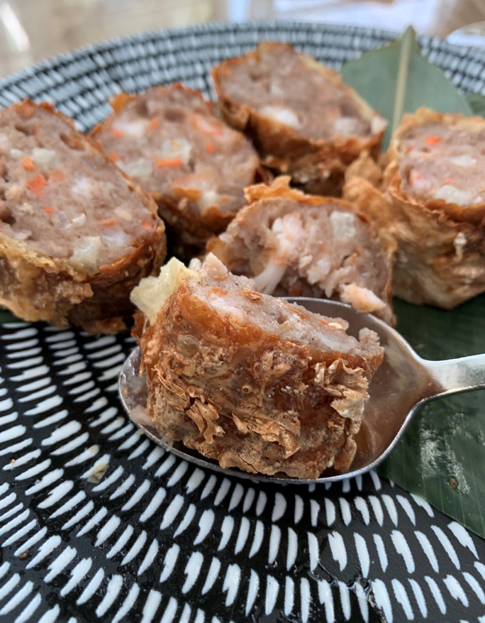 Our next course arrived shortly after, which was the Ngoh Hiang - or 5 spice roll with minced pork and prawns in crispy bean curd skin.