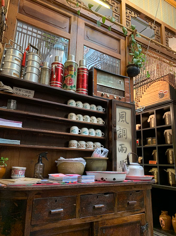 There was even a shelf with all these old-style teacups and tiffin containers, colloquially known as tingkat.