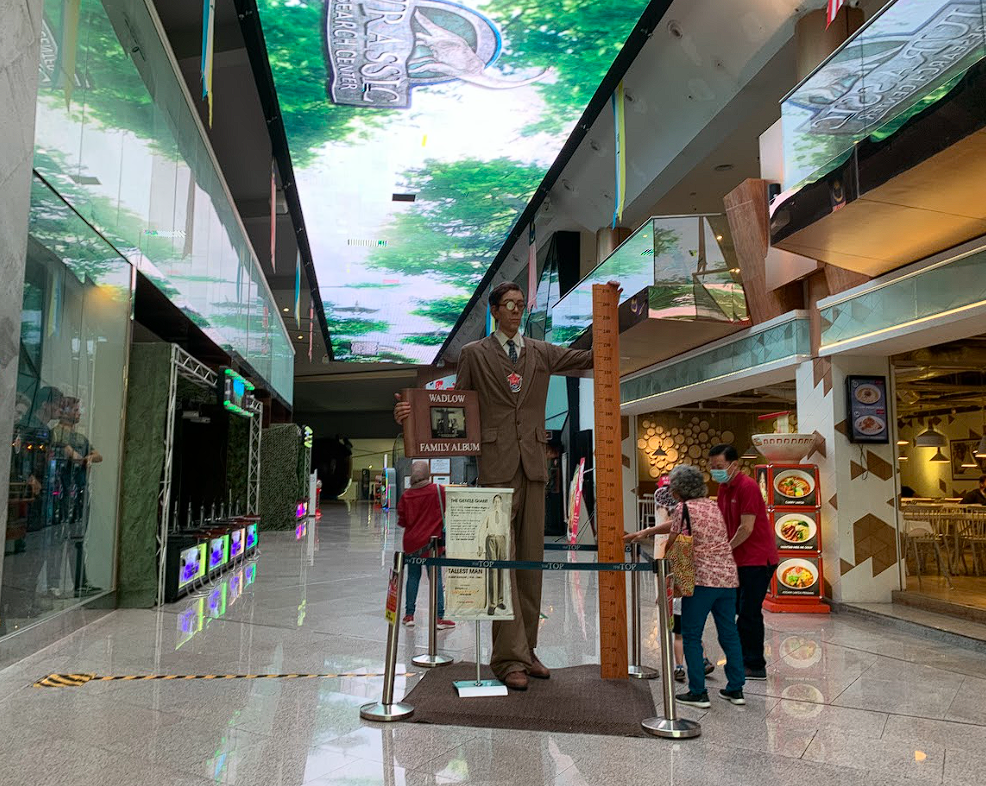 When we arrived at the lobby some floors up, we were greeted by this very tall sculpture, and a huge LED screen promoting the Jurassic Research Center attraction.