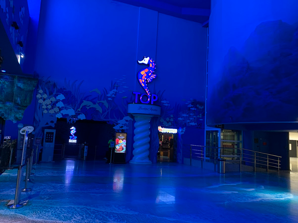 In order to dodge the noisy kids we decided to go check out the aquarium first which had a super deep blue lobby.