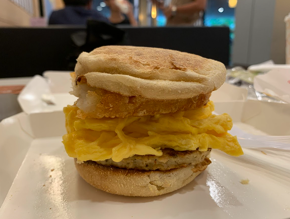 Sean got his favourite Sausage McMuffin with Egg while I ordered the Breakfast Delxue so we could share the pancakes. This set also included McMuffins, a sausage patty and scrambled egg so it was almost the same as a Sausage McMuffin with a different egg and no cheese.