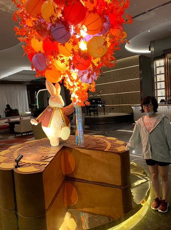 They had a very prominent statue of a rabbit standing on a mooncake holding a huge bouquet of lanterns and maple leaves in celebration of Mid-Autumn Festival, which is celebrated in Chinese culture.