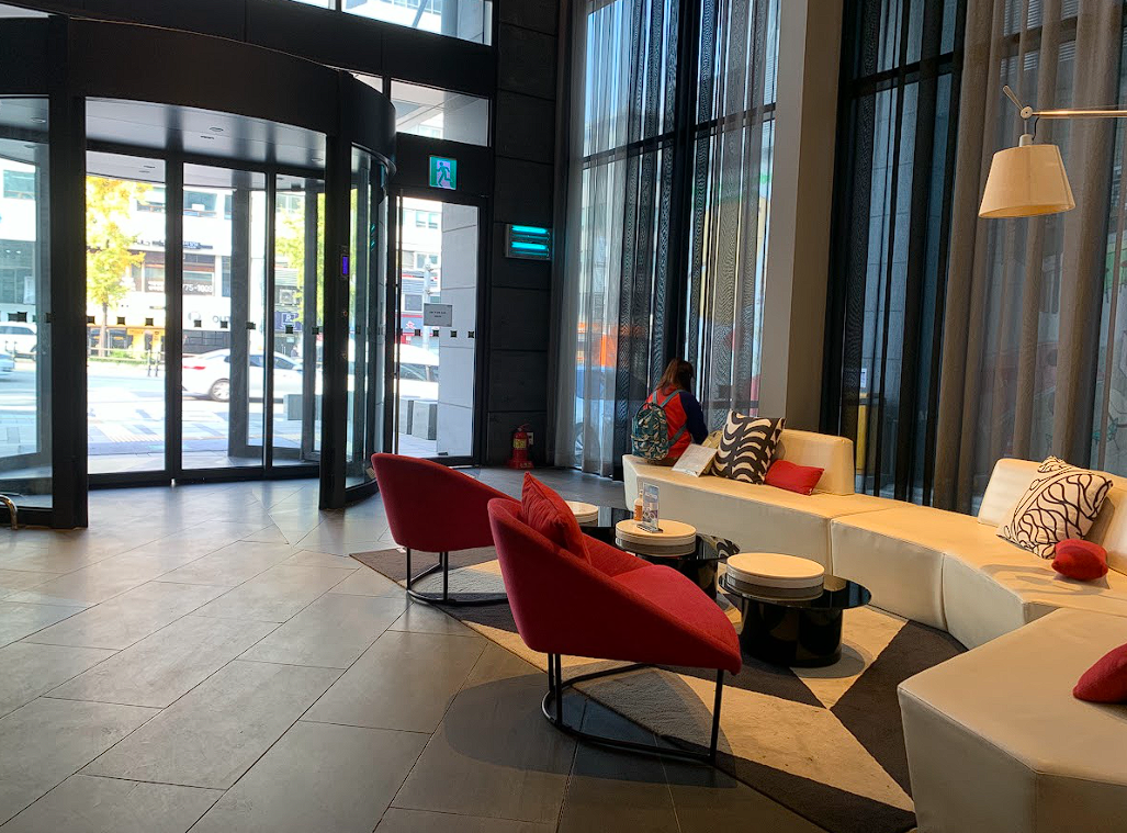 The lobby was quite nice and welcoming with some modern-looking furniture.