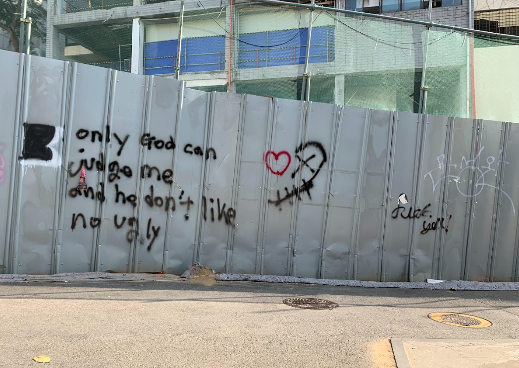 Unfortunately I think part of the mural street was closed off for some construction so we were blocked off. I think one of the buildings here was getting refurbished or something. But that didn't stop some people from spraying stuff on the construction barriers though, and there was one I thought was pretty funny.