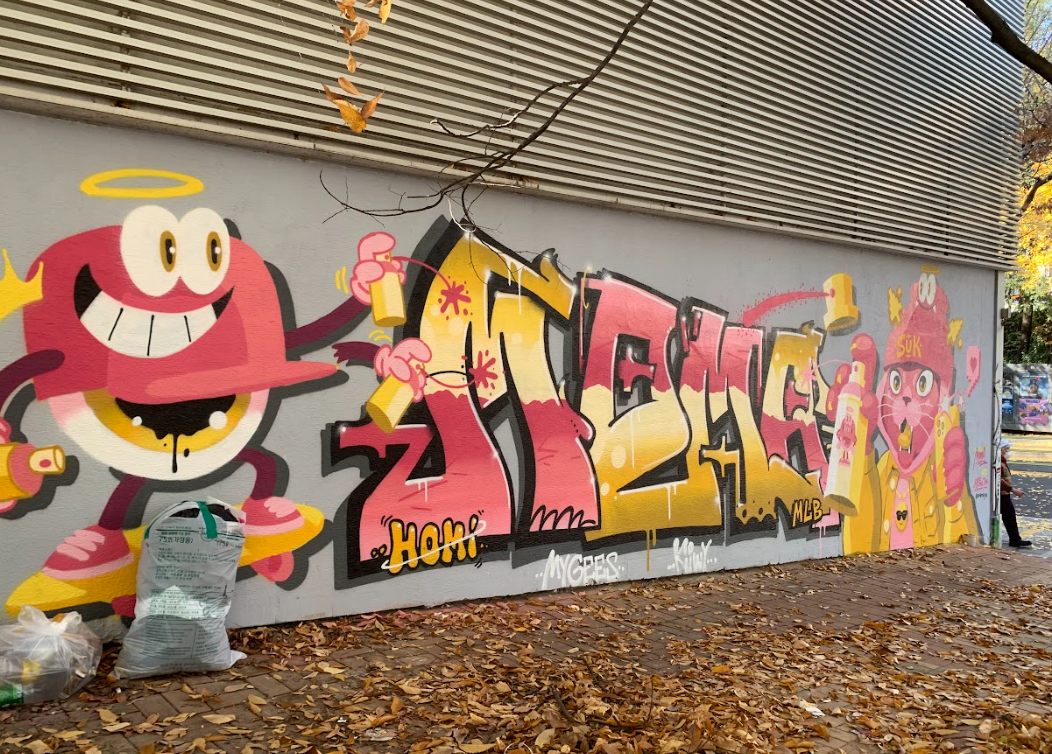 Eventually we found some a wall with street art right next to a cafe featuring some familiar characters on a very colourful background. It looked so good!