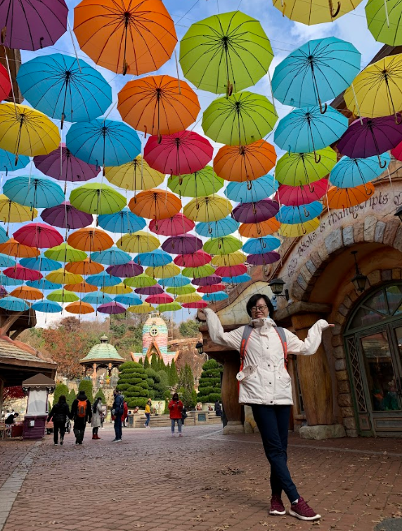 But we didn't buy anything and went outside to take a nice photo with these colourful overhanding umbrellas that reminded us of another theme park we went to in Japan that had a similar display.