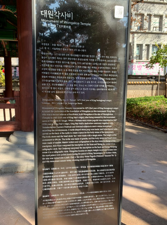 Just behind the Pavilion, you'll find the impressive ten-story stone pagoda of the Wongaksa Temple Site, a stunning testament to the architectural brilliance of its time. It was built in 1467 by King Sejo who decided to erect the Wongaksa temple after experiencing the wonder of sarira incarnation.